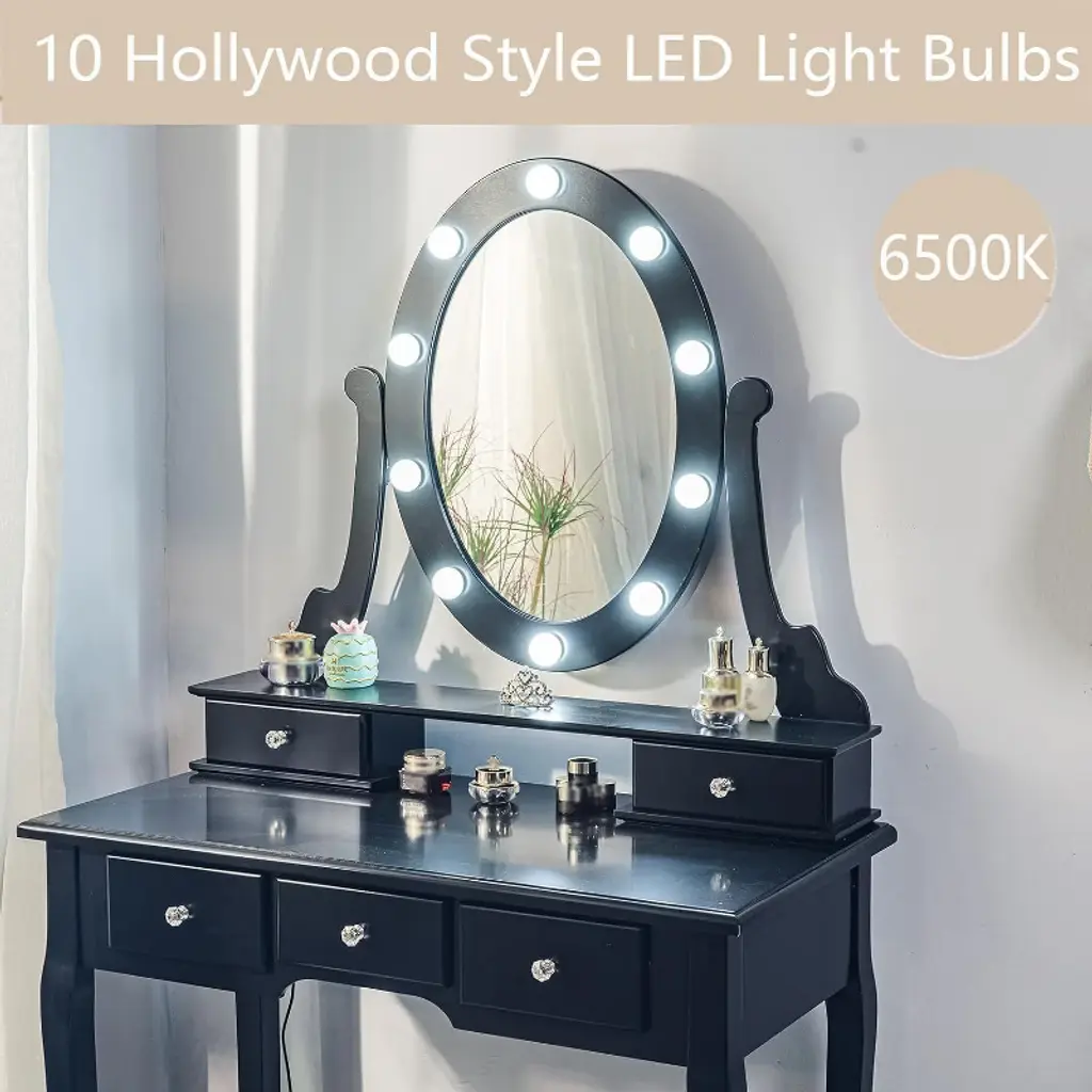 Vanity Desk, Vanity Mirror With Lights And Table Set With 5 Drawers, Wood Makeup Dressing Table With Oval Mirror & Stool For Bedroom Women Girls