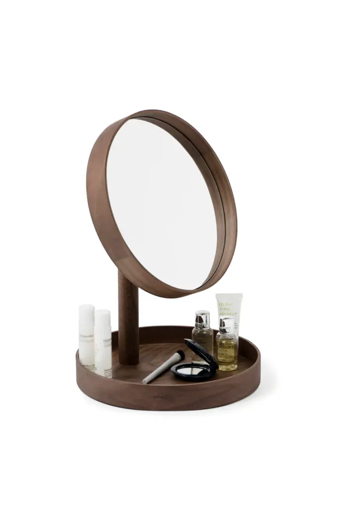 ‘Look’ mirror’s round, slim, wood, lip edge mirror looks contemporary. The base balances the design and acts as a practical storage tray keeping all your personal items in one place, conveniently close to hand. It’s ideal for dressing tables and bathrooms or simply as a decorative object. The times two magnification, the full-face mirror is designed with a tilting feature so it can be angled in any direction to find the perfect viewing position. The mirror is 245mm in diameter, large enough to get the full view.