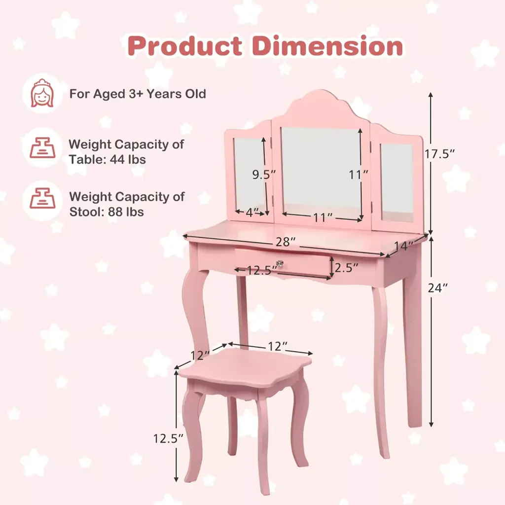 Each girl is a princess, Give your daughter a funky place to get beautified and indulge in the latest of fashion with this vanity table set. This brand new white child dressing table set is your best choice, The table equipped with a center mirror and two 180°folding mirror which will lets your princess admire her beauty from any angle. One big drawer and smooth tabletop provide enough space to place the jewelry ,cosmetics and knick-knacks. High quality MDF construction provides maximum strength and durability. And round corner design guarantee your child's safe. Don't hesitate to buy one ,you can't miss this itFeaturesElegant and modern design and classic white appearance MDF construction provide lasting durability One big drawers give you enough space to store all your things Tri-folding mirror,Two 180 degree folding mirror and a center mirror lets your princess admire her beauty from any angle It can help child organize their cosmetics, provide a comfy place to do makeup but also can be used as a study table This modern stylish dressing table fits well with any room decorColor: White/Pink Material of frame: MDF ,mirror Weight: 22 lbs Table size : 28.0"x14.0"x 41.5"(L X W X H) Stool size: 12.0"x12.0"x 12.5"(L X W X H) Weight capacity: 110 lbs package include: 1 X mirrored dressing table 1x stool