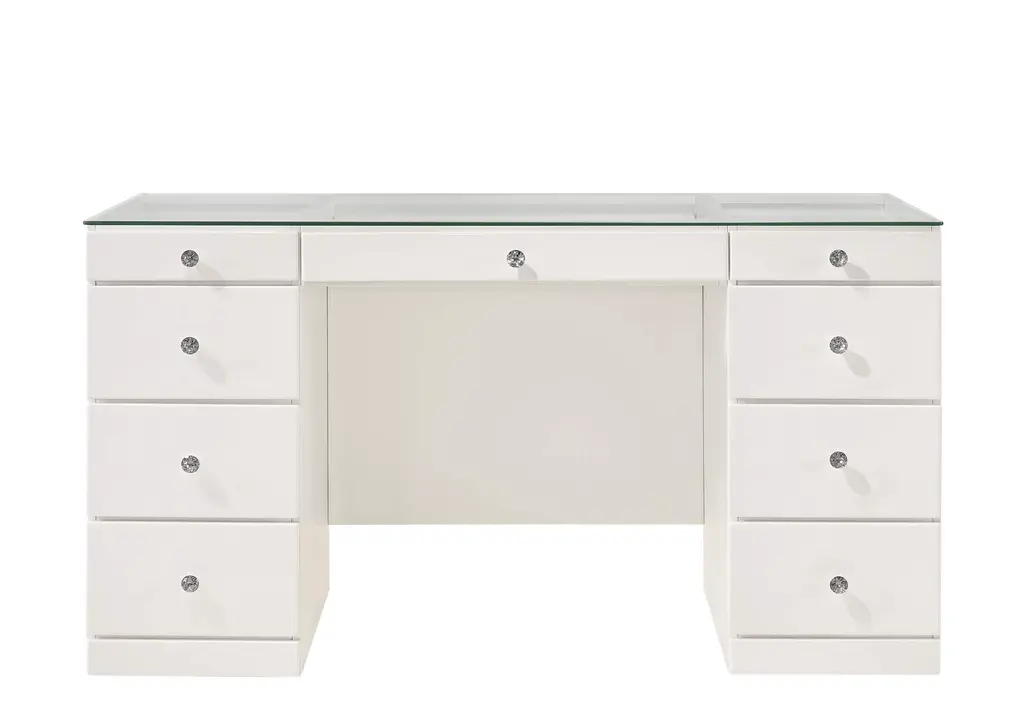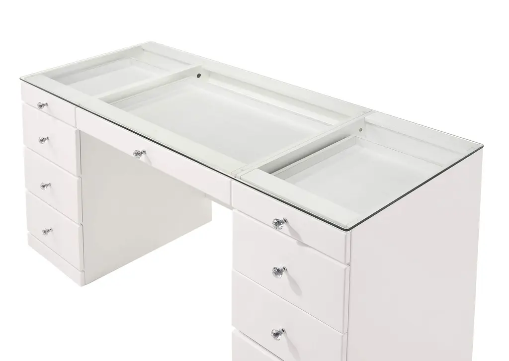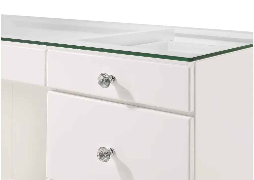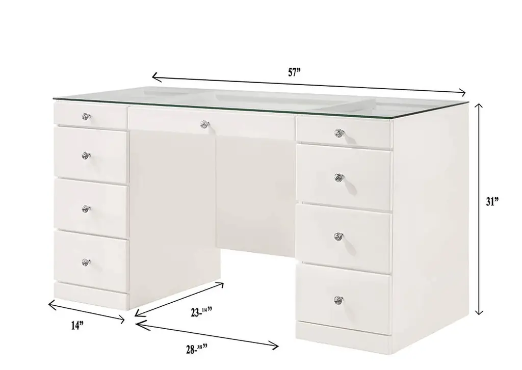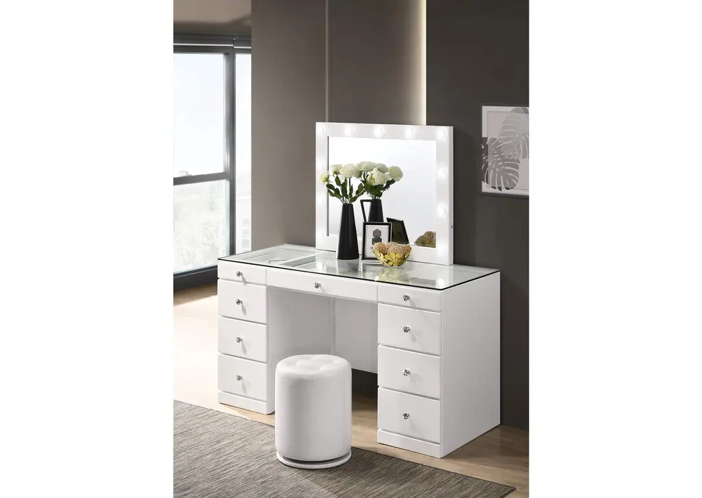 Step into a world of glamour with this sleek and chic vanity set, a perfect fusion of functionality and fashion. Its glossy white finish and clean lines are complemented by the sparkle of crystal-like knobs, adding a touch of sophistication to your personal space. The spacious tabletop, graced with a large mirror surrounded by radiant lights, offers an ideal stage for beauty routines, ensuring flawless makeup application under impeccable lighting. With a variety of drawers, this vanity provides ample storage to keep essentials organized and within reach. The stool with its luxurious upholstery provides a comfortable seat that rounds out this vanity set, making it a must-have for those who appreciate a touch of luxury in their daily life. Weight 166.400 lbs. (74.88kgs.)