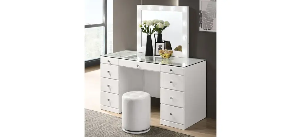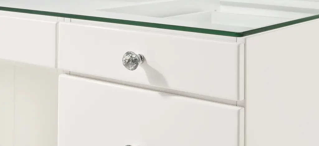 The Diem vanity features a glass top that makes for easy viewing of the first row of drawers. The full extension drawers allow for easy access for all your supplies. Whatever your need, this desk will be with you for years to come.