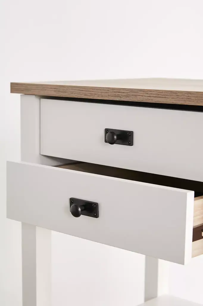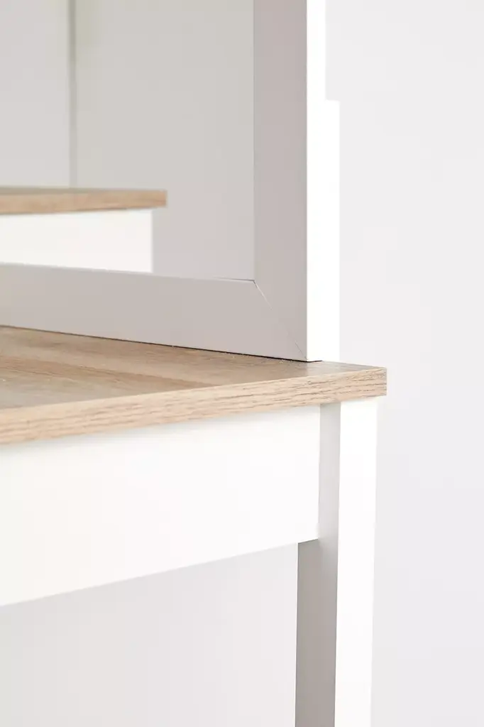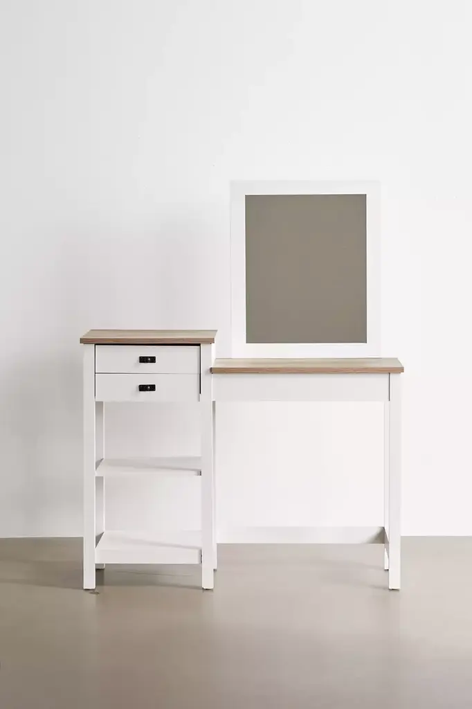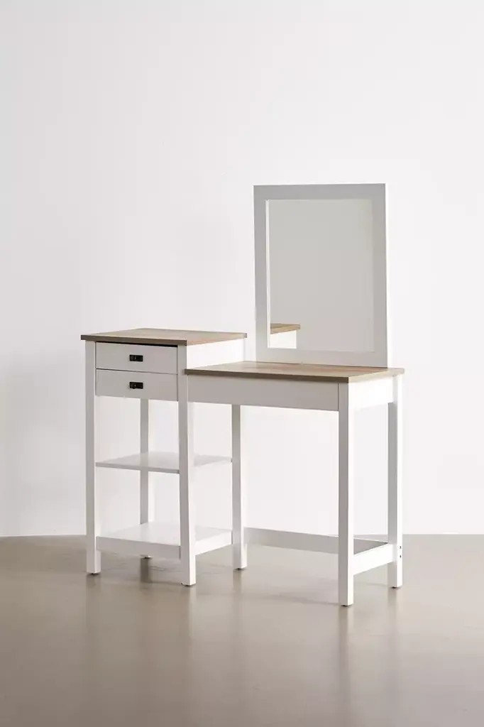 Modern classic vanity that curates a neat and tidy getting-ready space. Features a mirror, two slim drawers with roller glides and two open shelves for holding cosmetics, skin care and more. Assembly required.