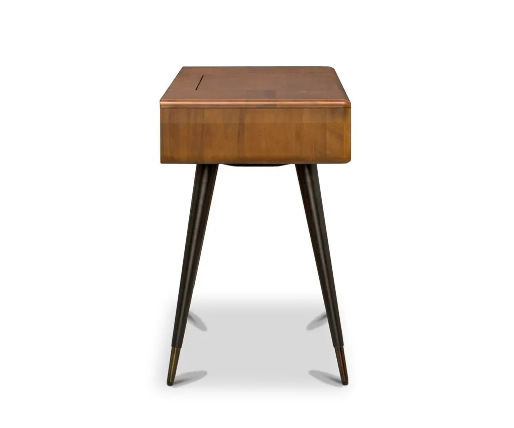 Did someone say statement-maker? The Lanson Vanity in light walnut is one of our newest favorites, a piece that melds exquisitely crafted storage with mid-century aesthetics in a classic way. Two drawers stash necessities, while the flip-top opens to reveal a mirror and segmented compartments. Angled, brass-capped legs