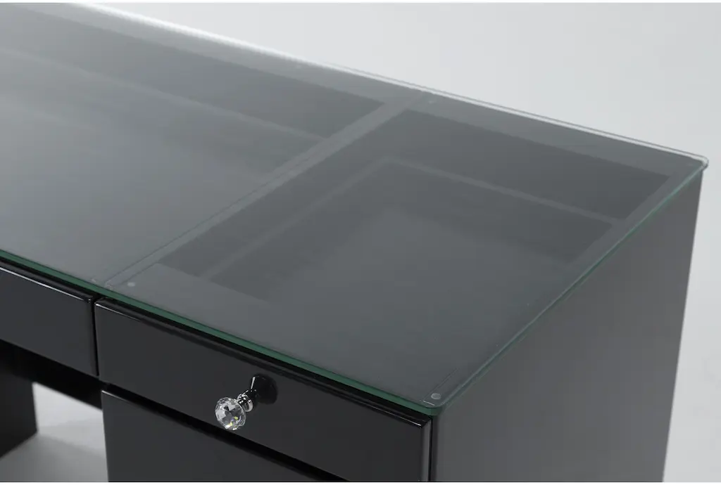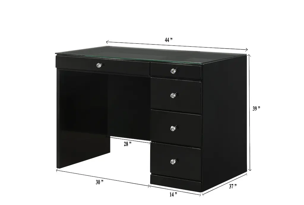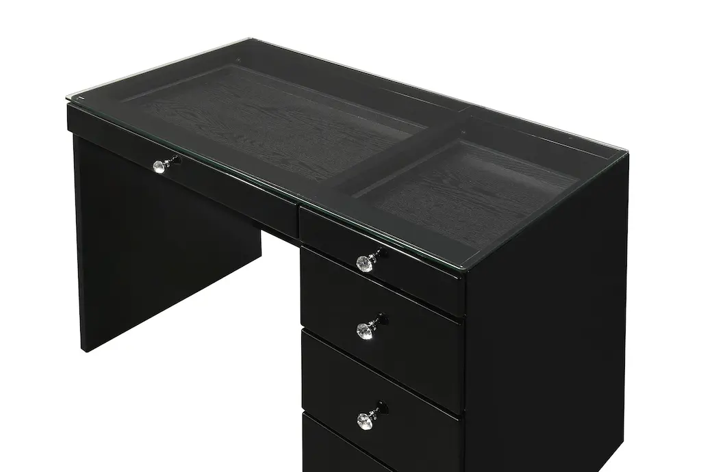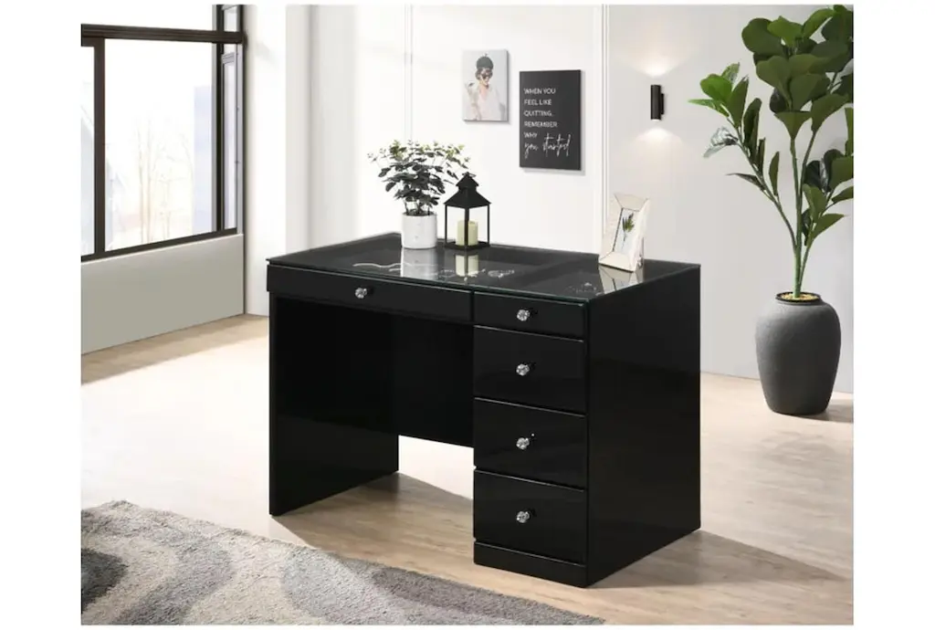 Mya Black Glass Top 5-Drawer Bedroom Makeup Vanity Desk