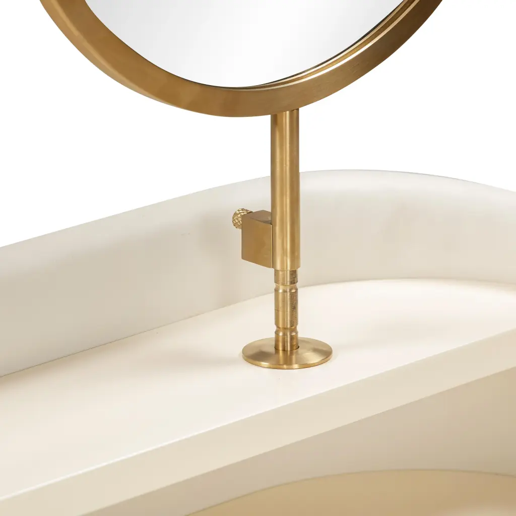Indulge in the boutique hotel elegance of the Penelope Vegan Leather Wrapped Vanity Desk. This piece oozes sophistication with its uber-chic design, while its velvet-lined drawer and convenient shelf provide a touch of luxury for all your beauty essentials. Complete with a glamorous attached mirror, it's the perfect companion for those "Get Ready with Me" moments, making your daily routine feel like a red-carpet event. Available in Cream or Taupe.