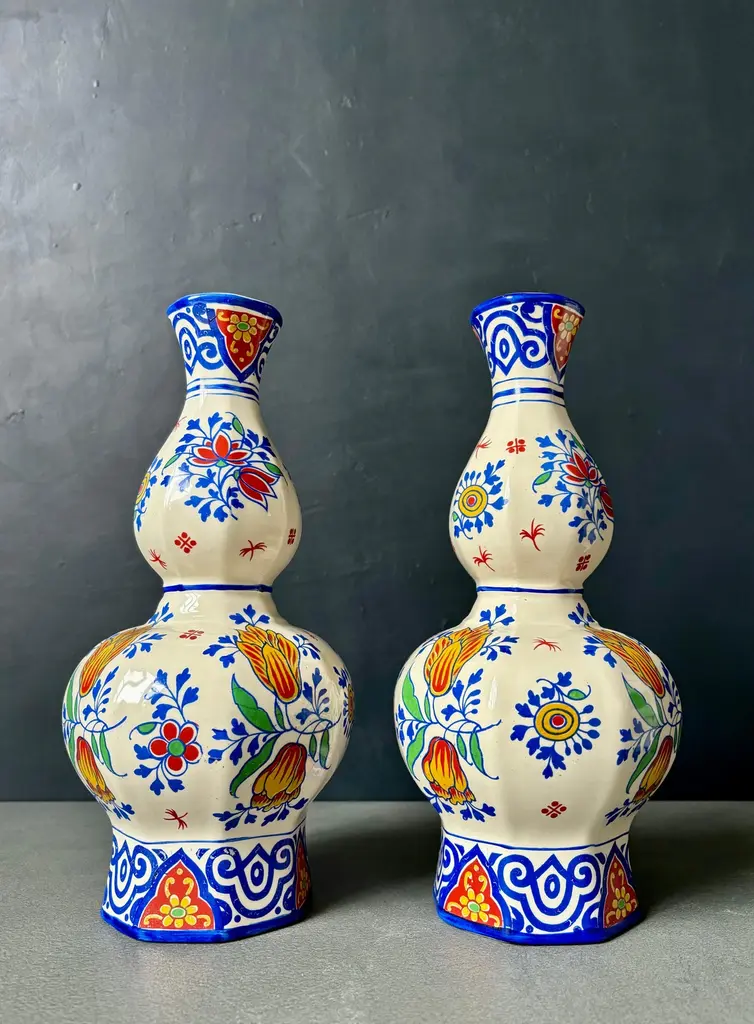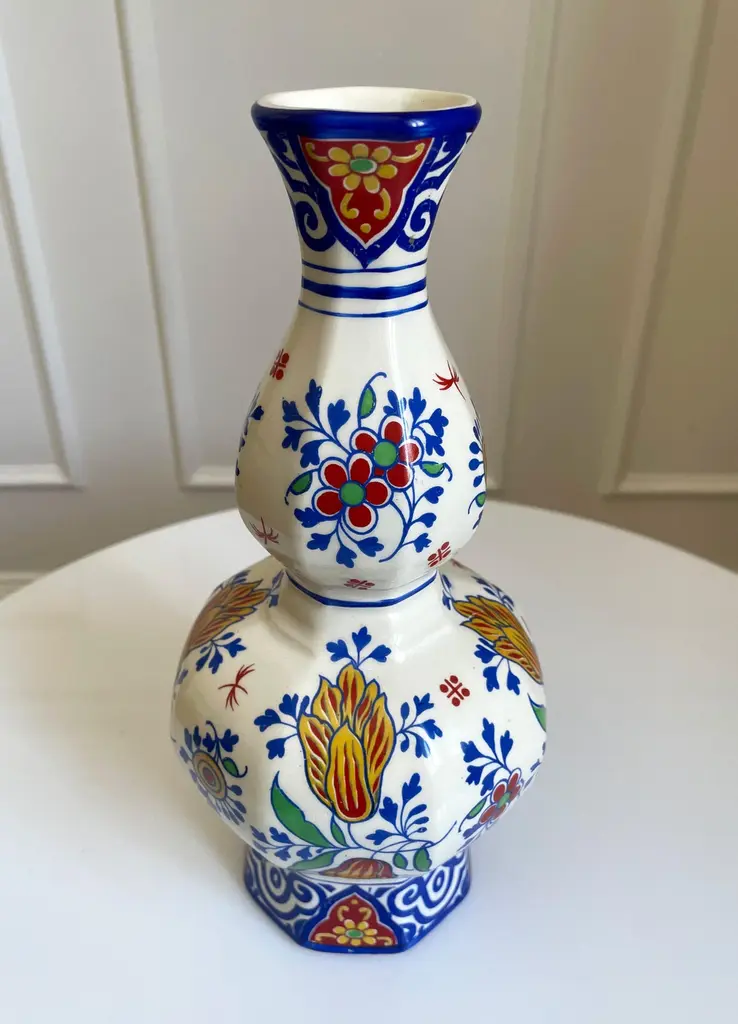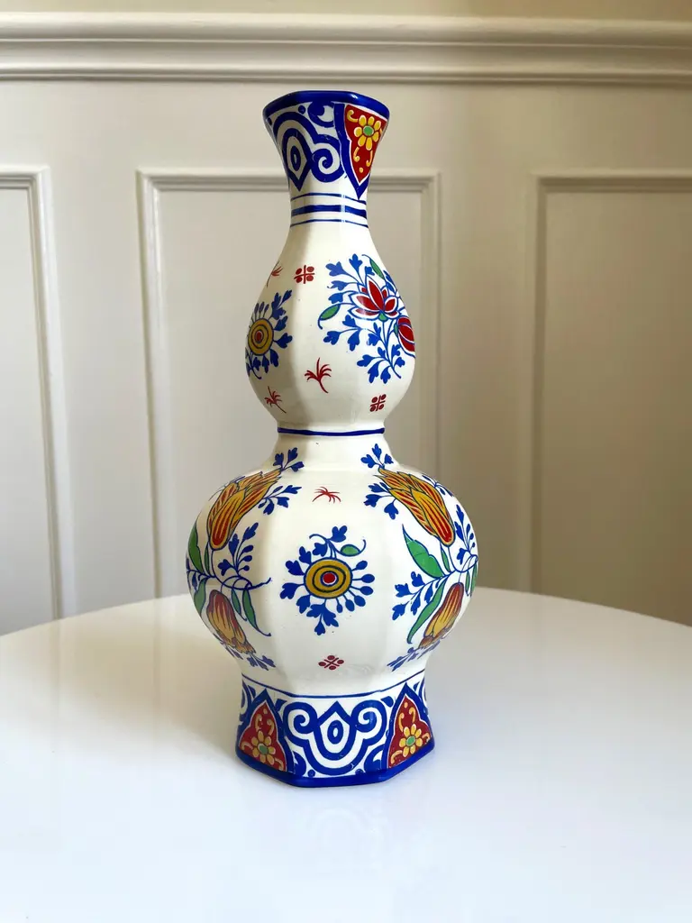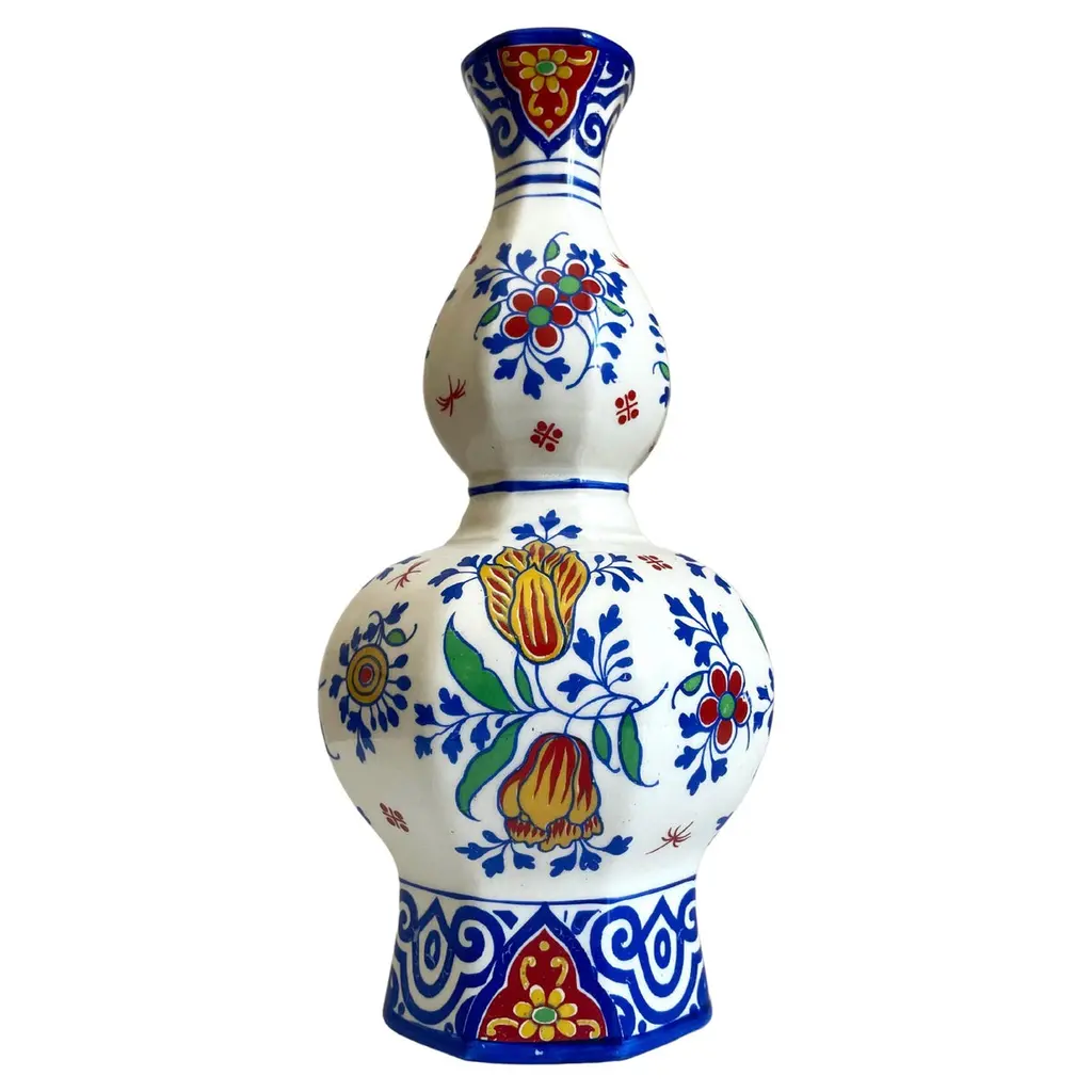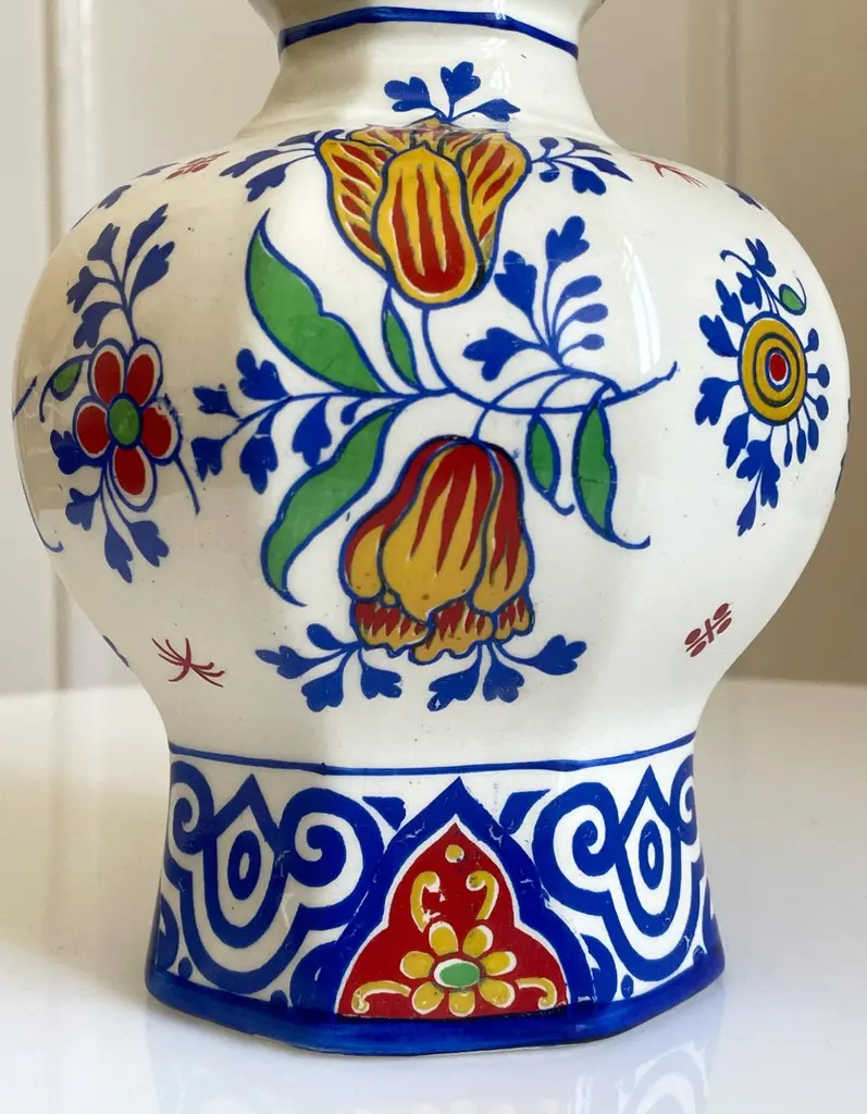 One of two colorful 100 year old Belgian Art Nouveau delft faience knobble vase by Charles Catteau's Boch Fréres Keramis at La Louviére, Belgium in the 1920s. Hand painted flowers, leaves and organic patterns in vibrant blue, red, yellow and green colors on cream white base. Company stamp in black and imprinted 1/66 and pattern number D191 under base. Beautiful vintage condition.Two items available - price per item. Free shipping.Belgium, 1920s.