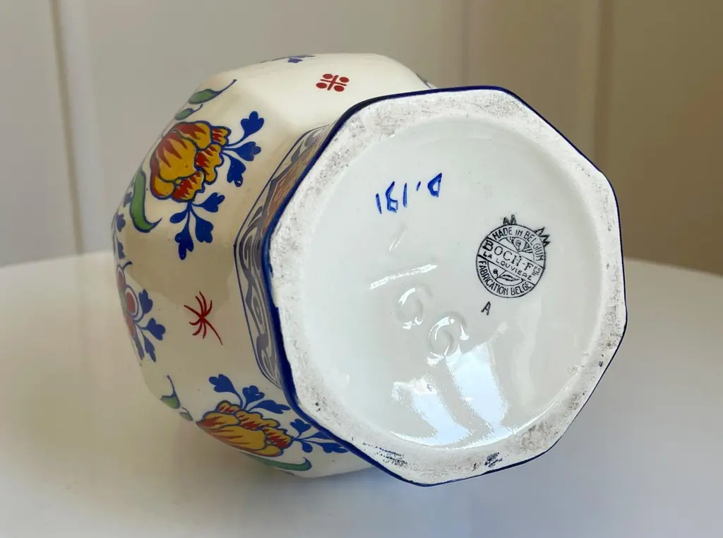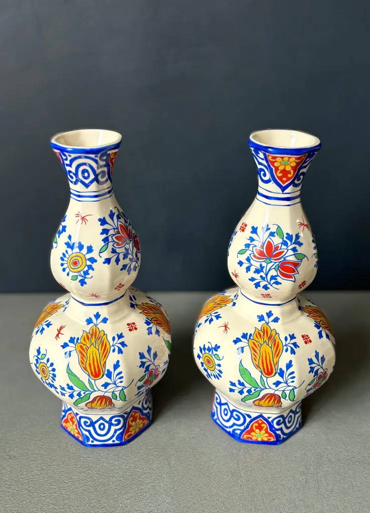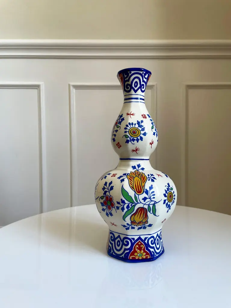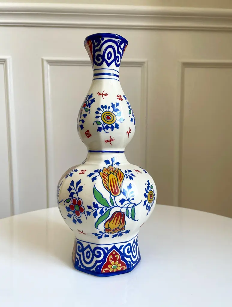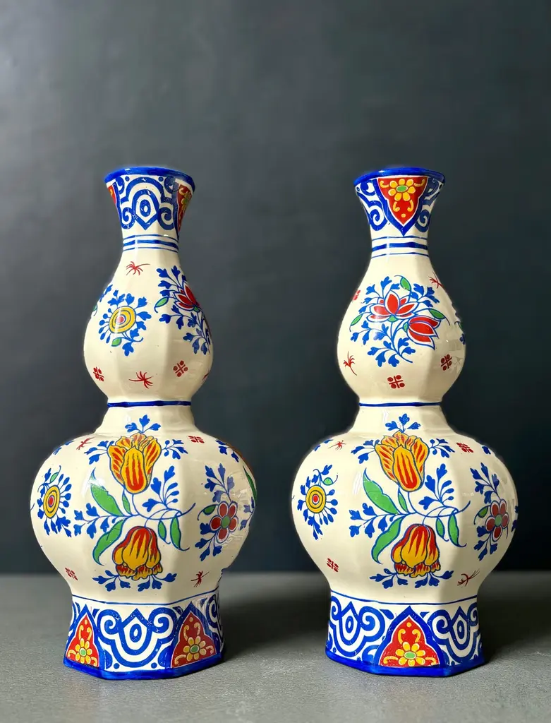 One of two colorful 100 year old Belgian Art Nouveau delft faience knobble vase by Charles Catteau's Boch Fréres Keramis at La Louviére, Belgium in the 1920s. Hand painted flowers, leaves and organic patterns in vibrant blue, red, yellow and green colors on cream white base. Company stamp in black and imprinted 1/66 and pattern number D191 under base. Beautiful vintage condition.Two items available - price per item. Free shipping.Belgium, 1920s.