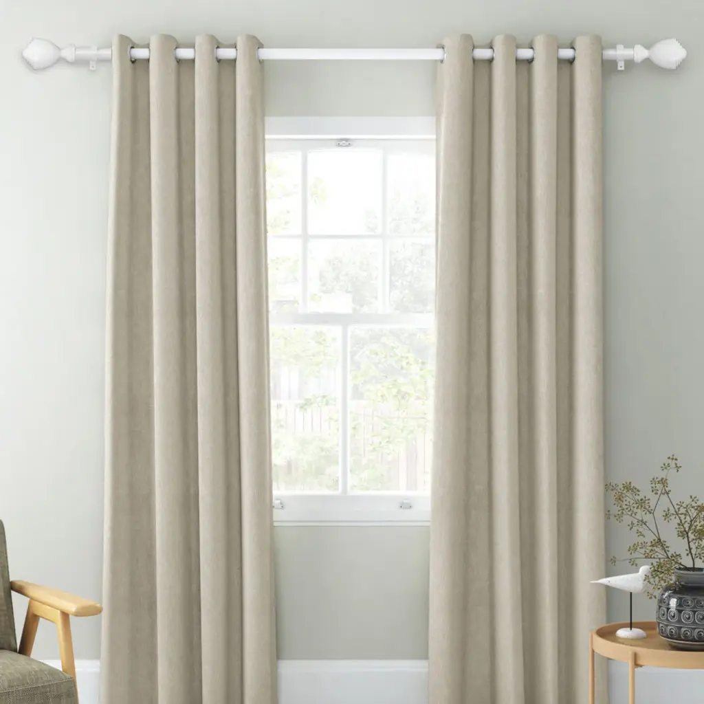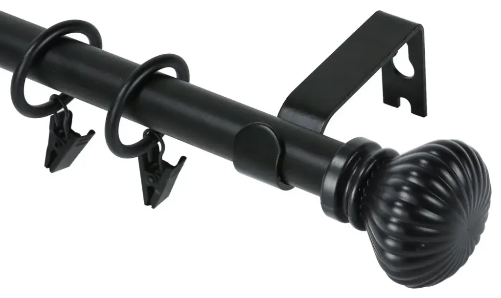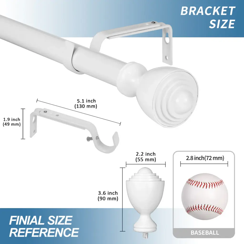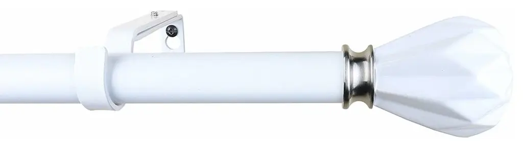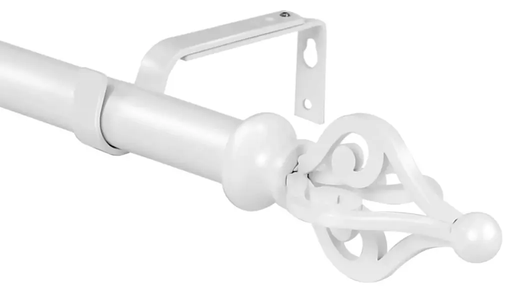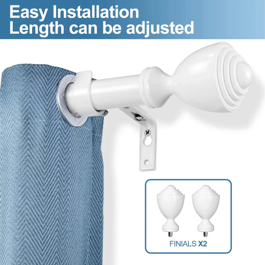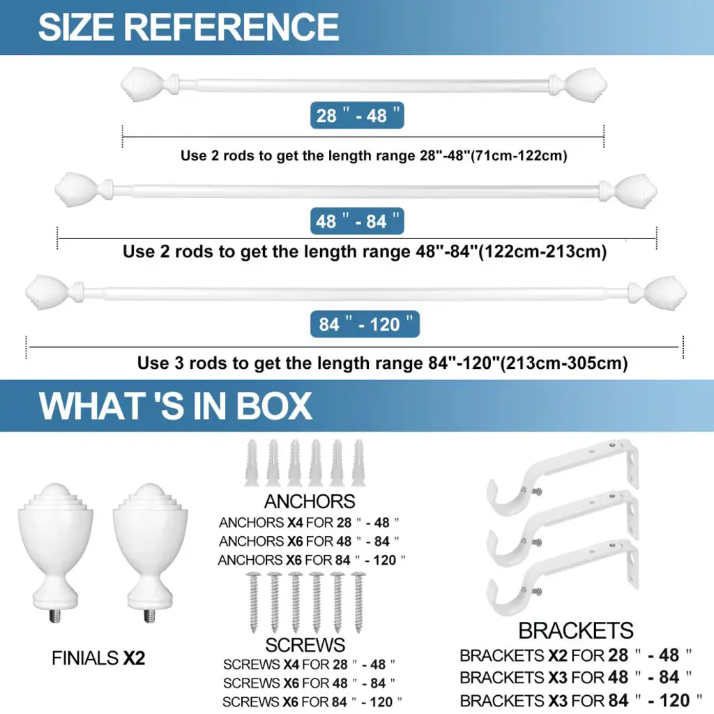 The rod set includes 1 rod, 1 set of two finials, and brackets in a glossy white finish.The adjustable curtain rod measures 1" diameter and comes with decorative finials. The finials measure 3 5/8" long and 2 1/8" across. The rod extends from 84" to 120".Available in 5 finishes: Black, Glossy White, Bronze, Brushed Steel, and Antique BrassMounting hardware included for easy installation.