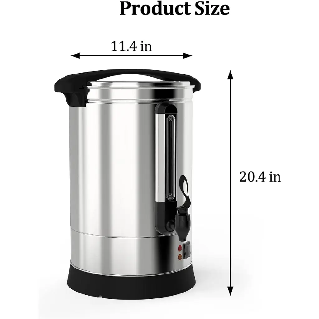 Product DescriptionAfter brewing, the urn keeps coffee hot and ready to pour without overheating or burning, so coffee tastes great whether it's the first cup served or the last. The urn makes 100-120 cups of coffee and is perfect for serving large crowds, whether you're having a family reunion or a party, and also lets you make less coffee when needed. Product Feature【Sleek Design to Fit Anywhere】Sleek design with matte and metallic surface that fit right into the working place.【Keeps Your Coffee Warm】Two indicator lights located at the bottom of the coffee maker to indicate the working status and aways keeps your coffee warm and ready to serve.【No Additional Paper Filters Needed】Duty-ready filter grid. No need to purchase additional paper filters. Start to brew whenever you want.Product informationColor: SilverProduct Dimensions: 11.4"D x 11.4"W x 20.4"HItem Weight: 10.38 poundsCapacity: 14L, 18LCoffee Maker Type: Drip Coffee MachineOperation Mode: Fully AutomaticPackage List1 x Coffee Urn1 x User Manual