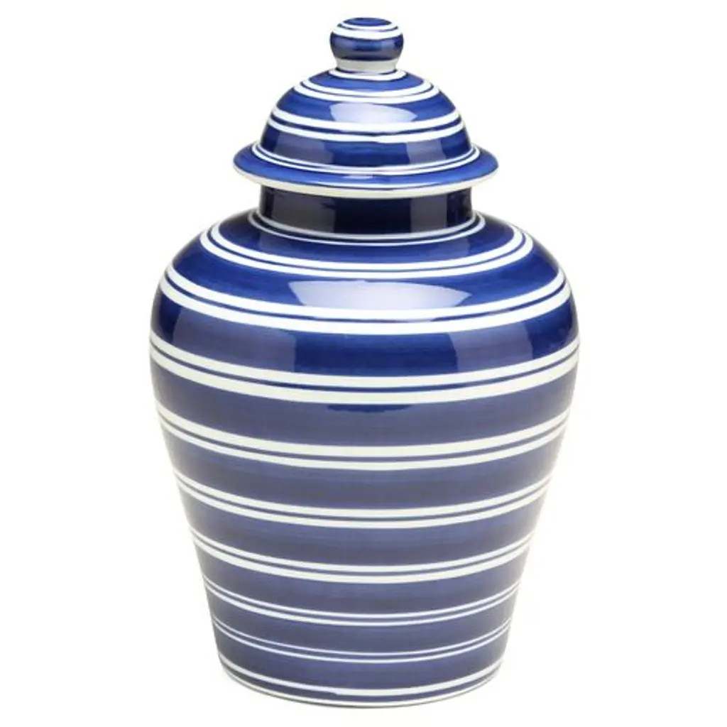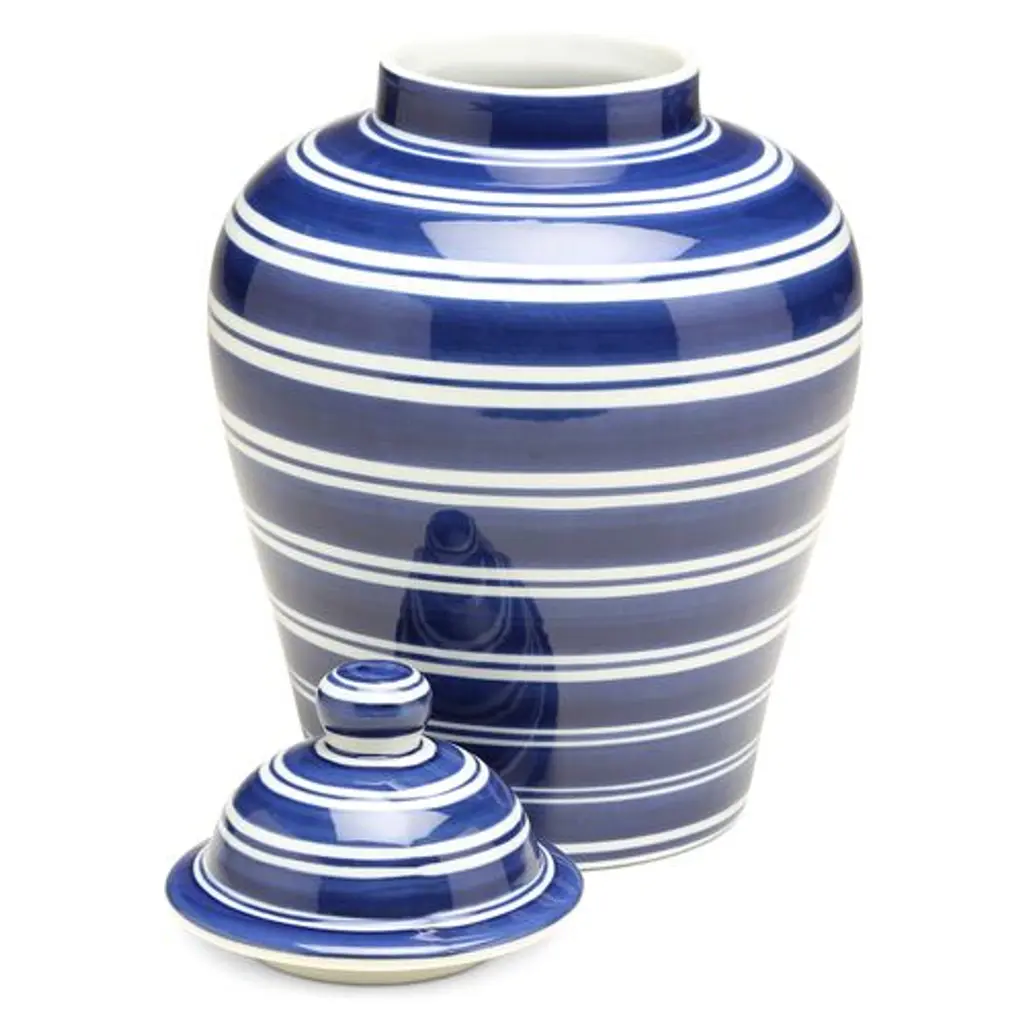 Designed with classic stripes in blue and white, this porcelain ginger jar is sure to stand out on any shelf, console, or mantel.