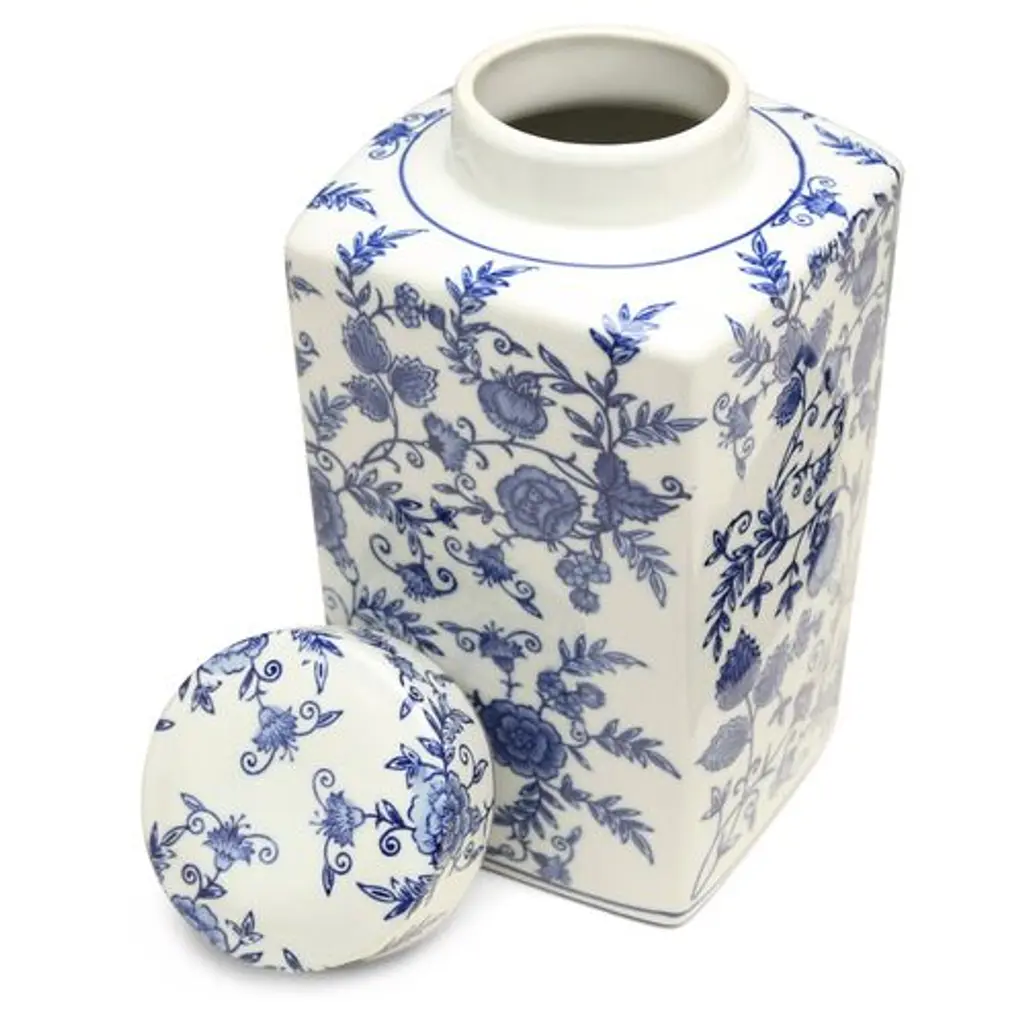 Designed with classic floral motifs in blue and white, this porcelain ginger jar is sure to stand out on any shelf, console, or mantel.