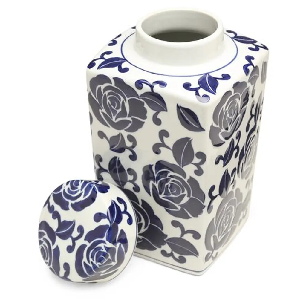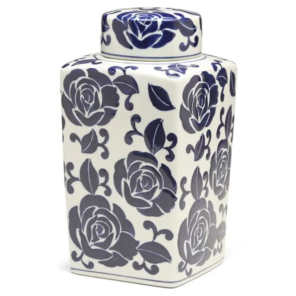Designed with classic floral motifs in blue and white, this porcelain ginger jar is sure to stand out on any shelf, console, or mantel.