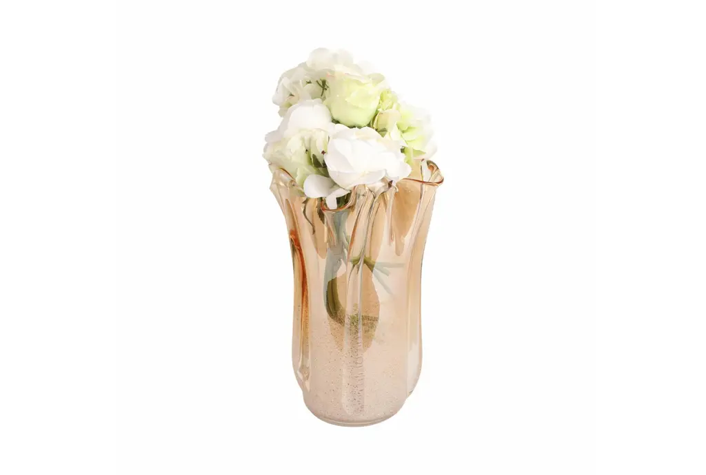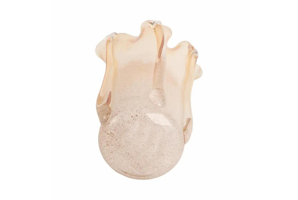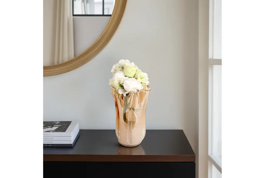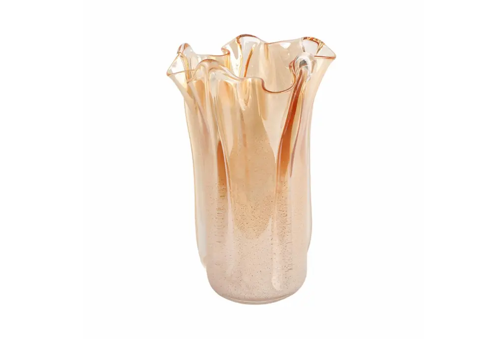 Enhance your home with the 13" Iridescent Orange Bartoli Artisan Blown Glass Vase. This stunning piece features an organic shape that adds a touch of modern artistry to any space. The tan glass material brings a warm and neutral tone, making it a versatile addition to your decor.