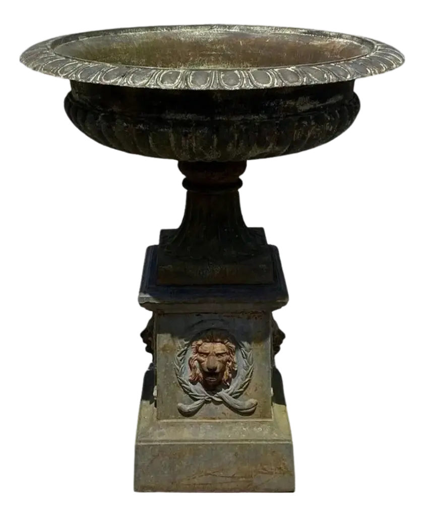 We love the stately, traditional look of this lion-head urn. Its rusty hue adds to the look.