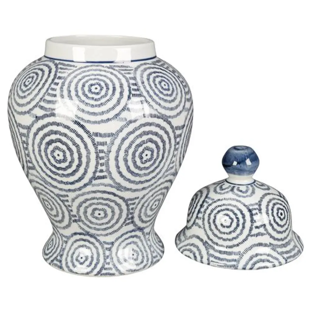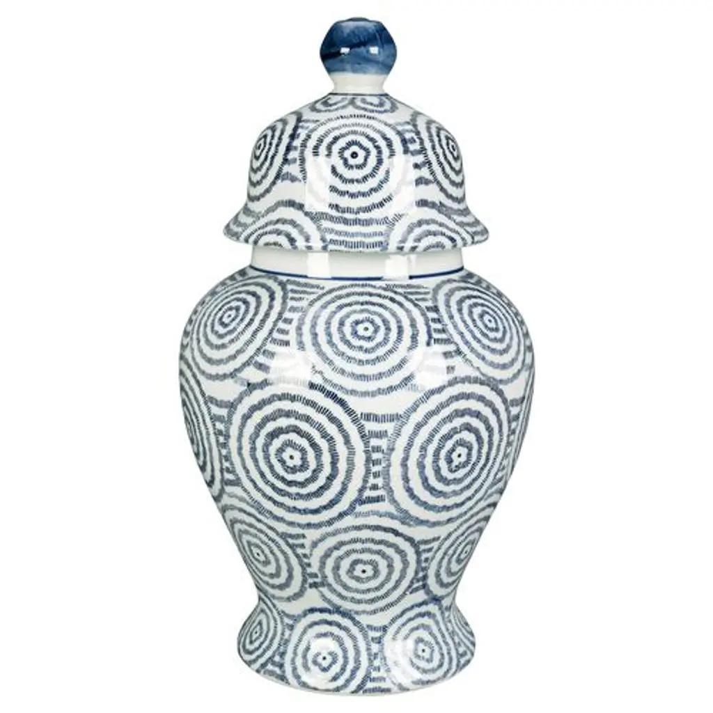 A contemporary motif of blue concentric circles gives this porcelain ginger jar a fresh vibe without detracting from the elegance of its classic silhouette.