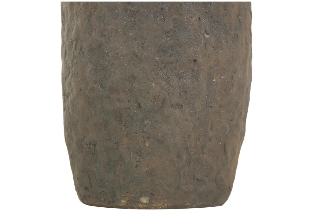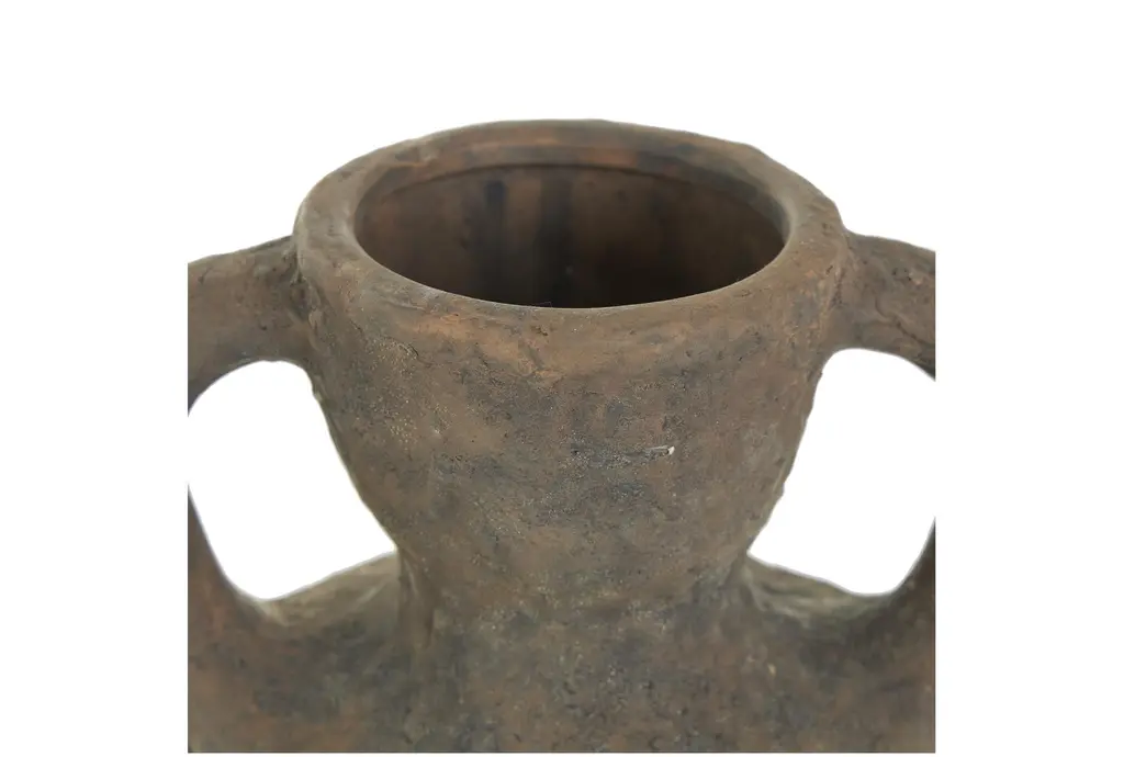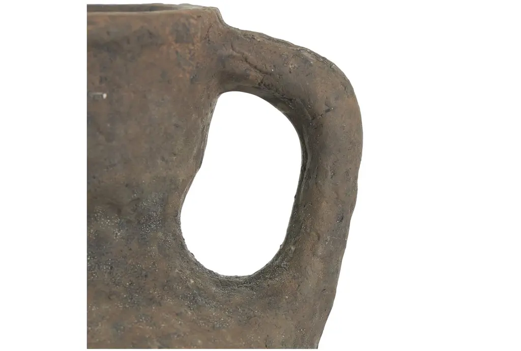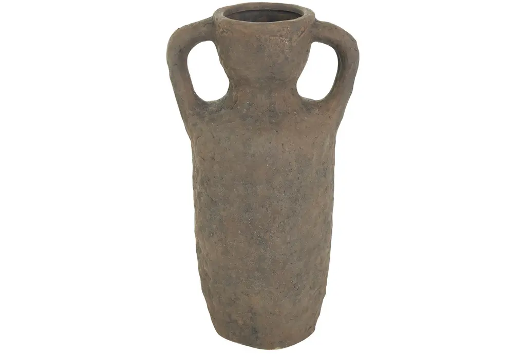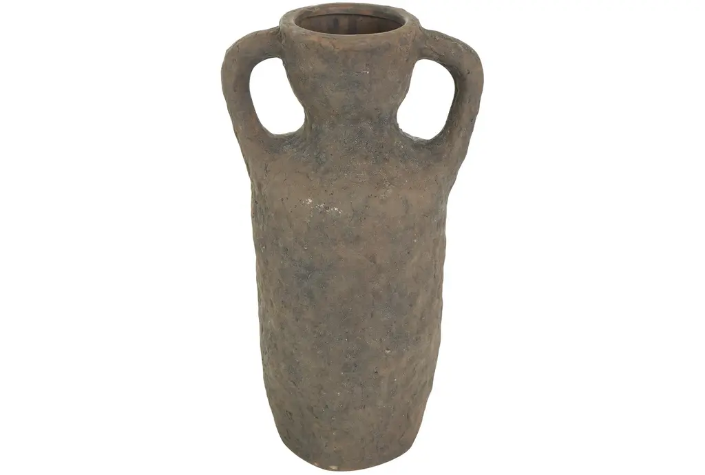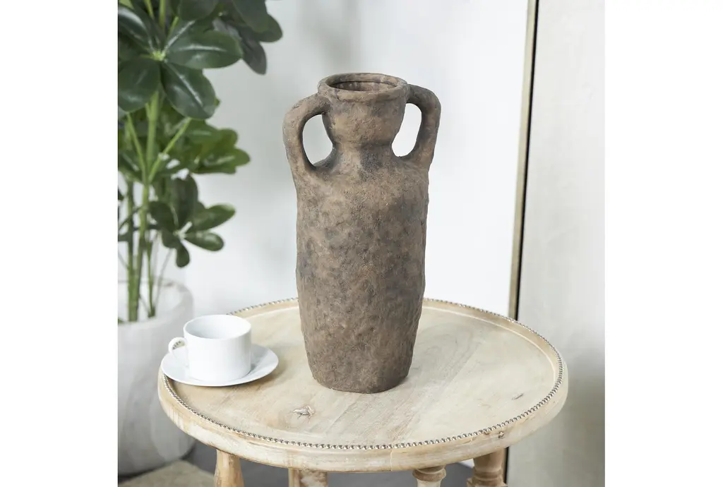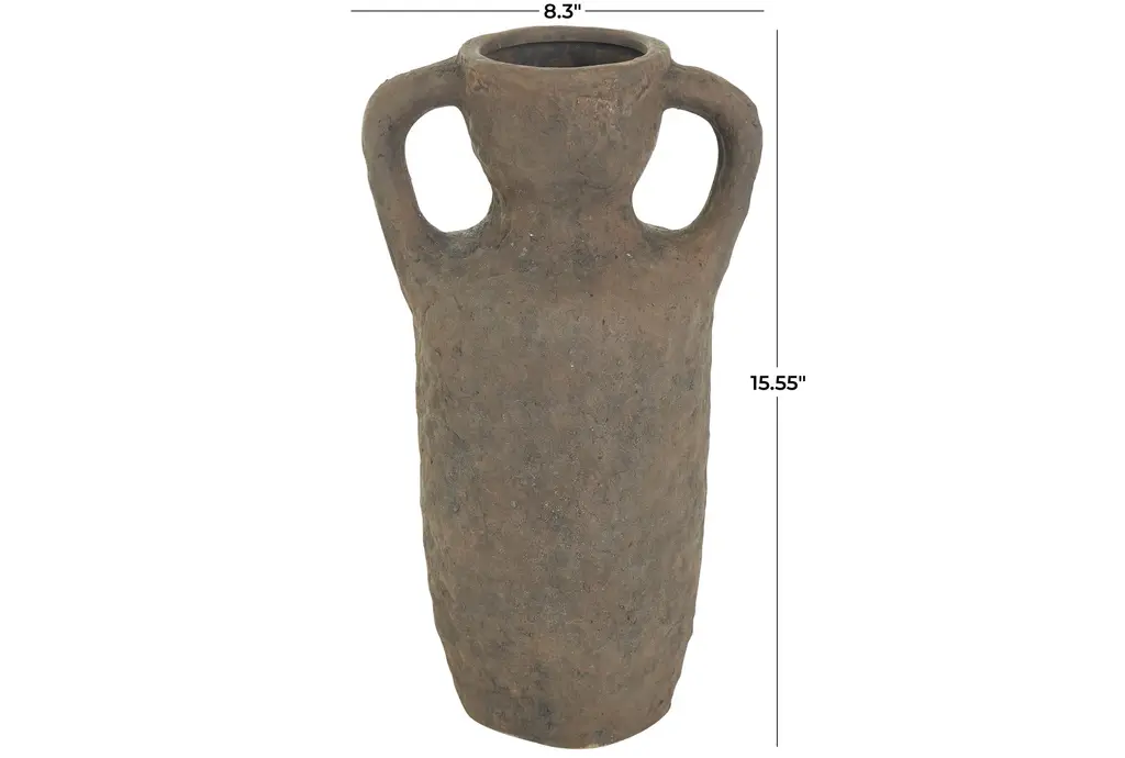 This 15" Brown Distressed Ceramic Amphora Vase is a rustic, handcrafted piece made from solid stoneware. Its dark brown, distressed texture gives it an organic look, making it a timeless accent for any home decor.