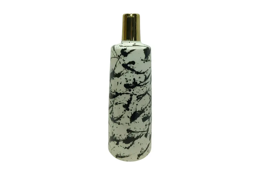 This 15 Inch Vase with a Gold Lid is a modern, ceramic piece in a clean white color. Its sleek design and elegant gold lid make it a perfect addition to any contemporary decor.