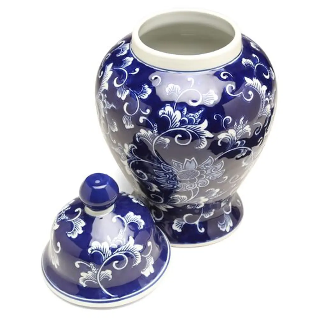 Designed with classic floral motifs in blue and white, this porcelain ginger jar is sure to stand out on any shelf, console, or mantel.