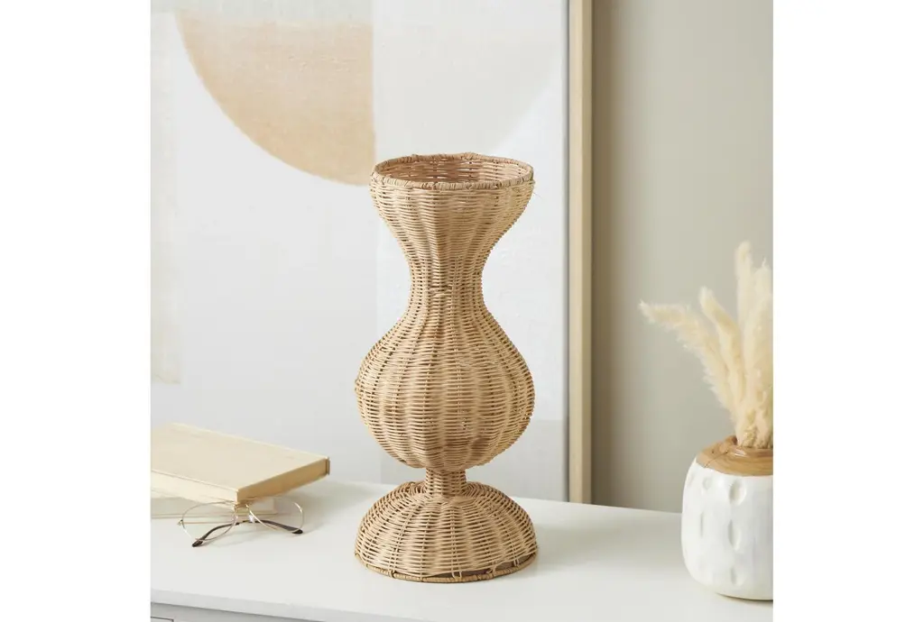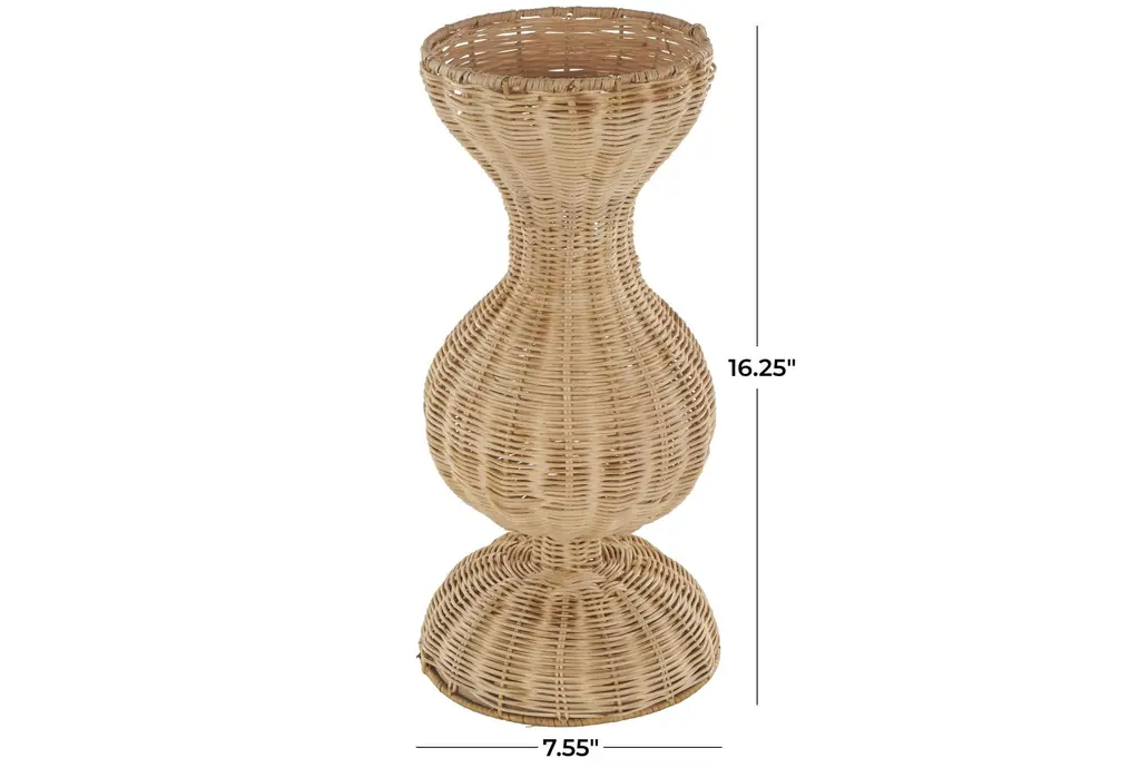 Infuse your home with cozy charm with this 16" Brown Rattan Handmade Woven Hourglass with Dome Base Vase. The modern design, combined with boho elements, creates a wholesome atmosphere with weathered textures, rustic finishes, and warm earthy tones. This round home decor vase boasts a rich, textured brown finish that adds an earthy touch to any décor.