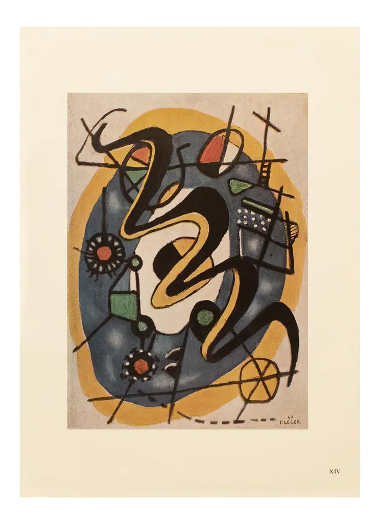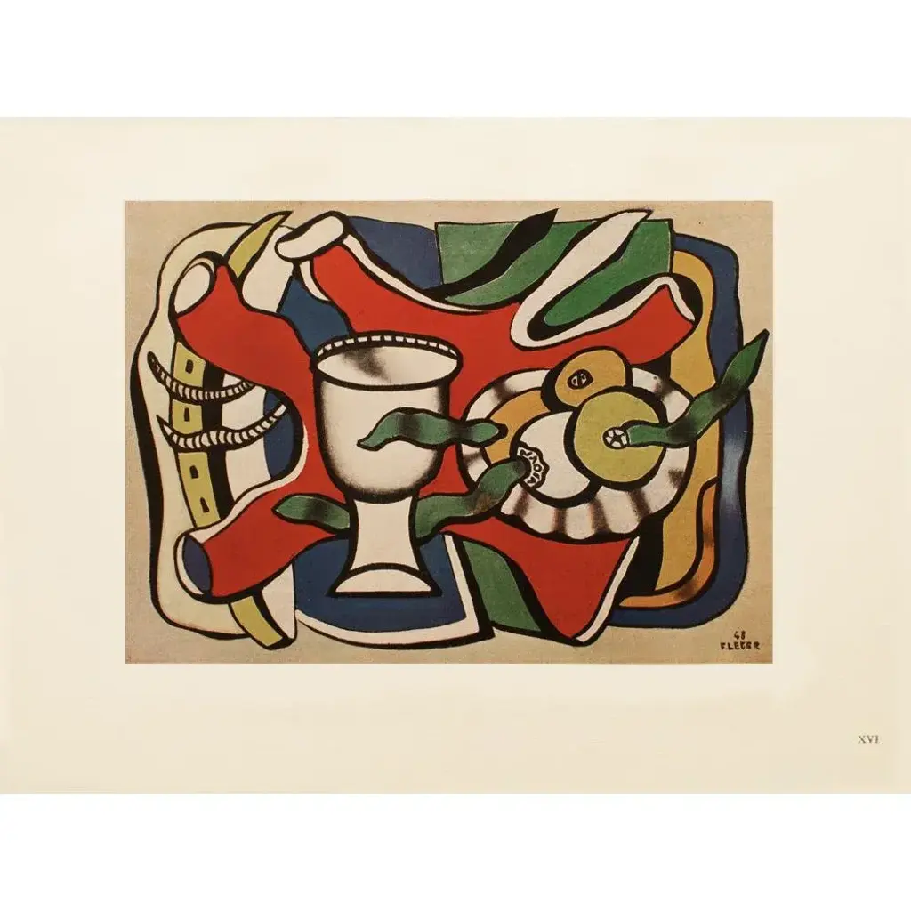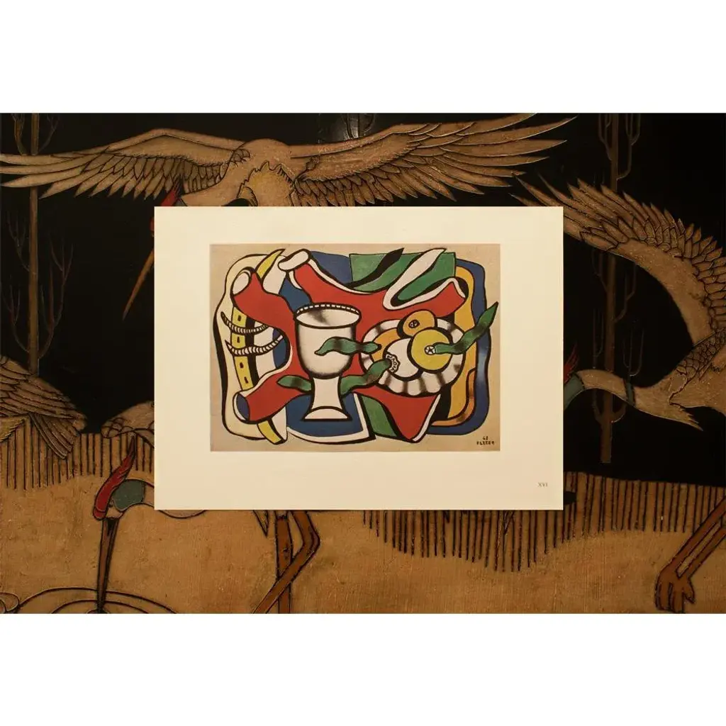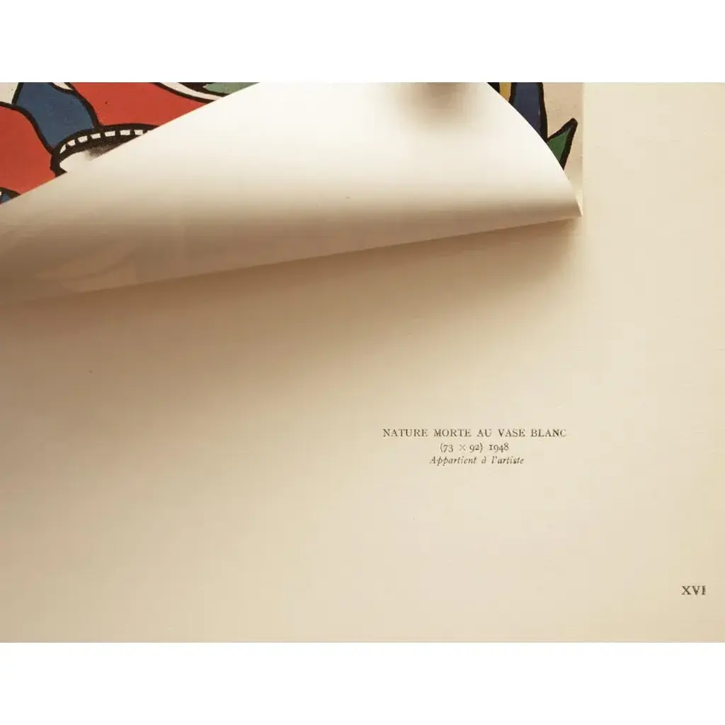 An excellent period offset lithograph, print, of painting "Nature Morte Au Vase Blanc" (Still Life With White Vase, 1948) by Fernand Léger, was published and printed in the same year when the original artwork was painted. Comes from a First Limited Edition art folio published by Editions Du Chene in Paris, France in 1948. Edition N266. Signed in the print (printed) at the lower right corner: "48 F. Leger". Printed on one side. Hand tipped-in on a board of heavy paper. Information regarding the original artwork will be found in French by lifting the piece. Numbered "XVI" in lower right corner. Excellent condition of the print; minor age and edge wear on the board; never framed. Overall 15"W x 11"H Image 10.65"W x 7.55"H