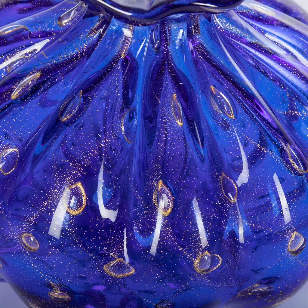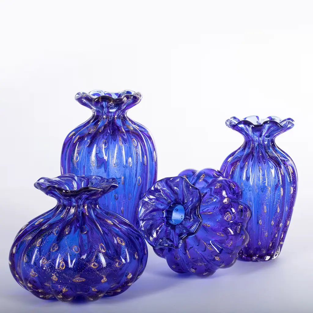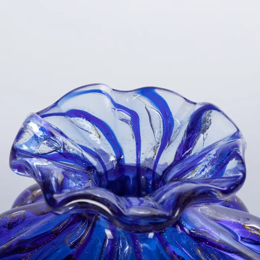 Discreet in their dimensions as they are breath-taking in their design, the two vases composing this set in mouth-blown Murano glass will infuse any home with a dreamy allure. The charming flounced texture emphasizes the fine quality of the glass and the shimmering speckles of 24K gold trapped within and also gathered around deliberate air bubbles. They will make for sublime vases for wildflowers or home fragrance containers.