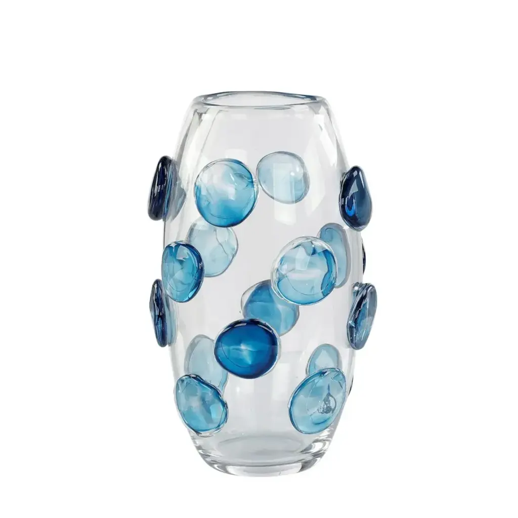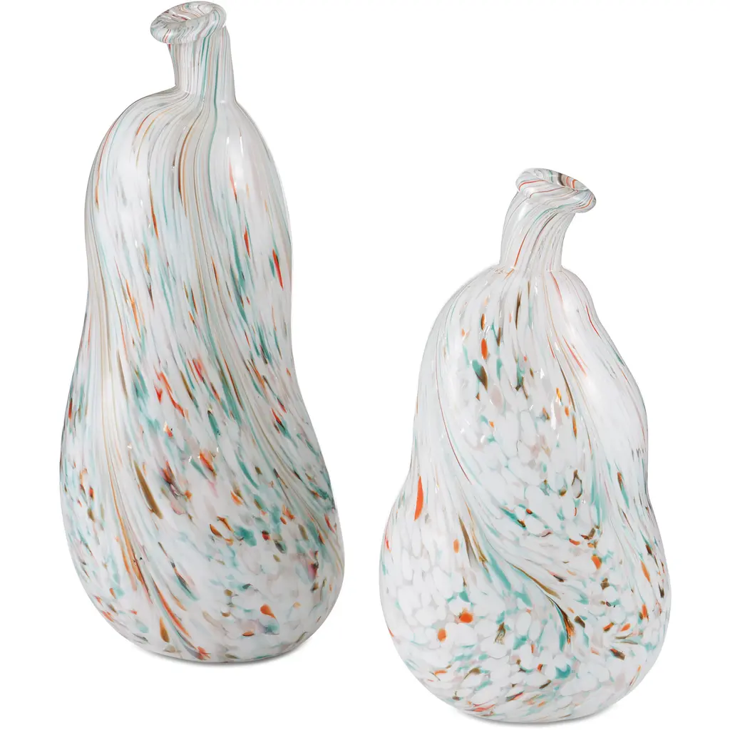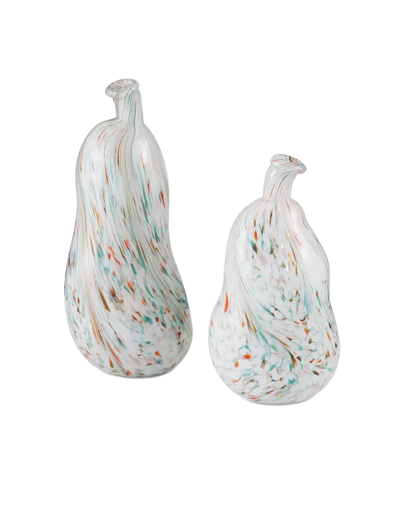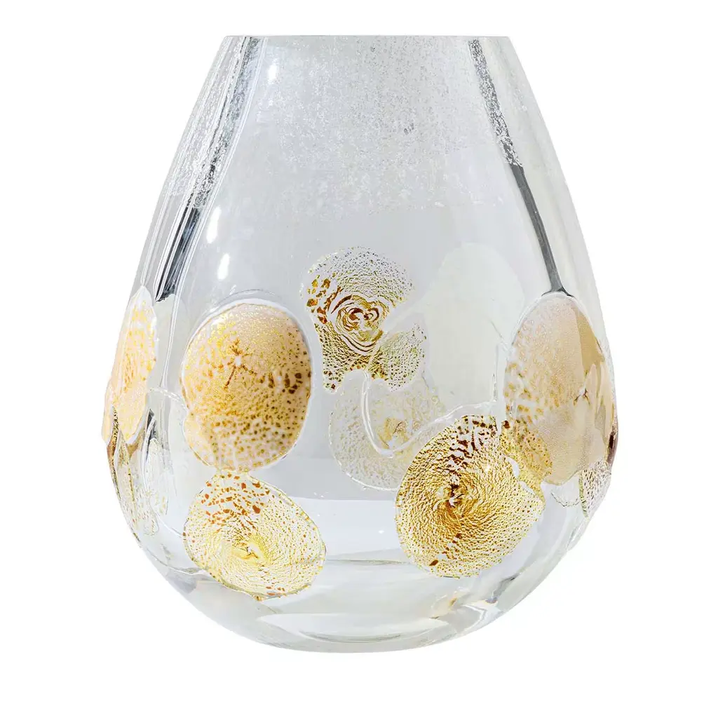 Discreet in their dimensions as they are breath-taking in their design, the two vases composing this set in mouth-blown Murano glass will infuse any home with a dreamy allure. The charming flounced texture emphasizes the fine quality of the glass and the shimmering speckles of 24K gold trapped within and also gathered around deliberate air bubbles. They will make for sublime vases for wildflowers or home fragrance containers.