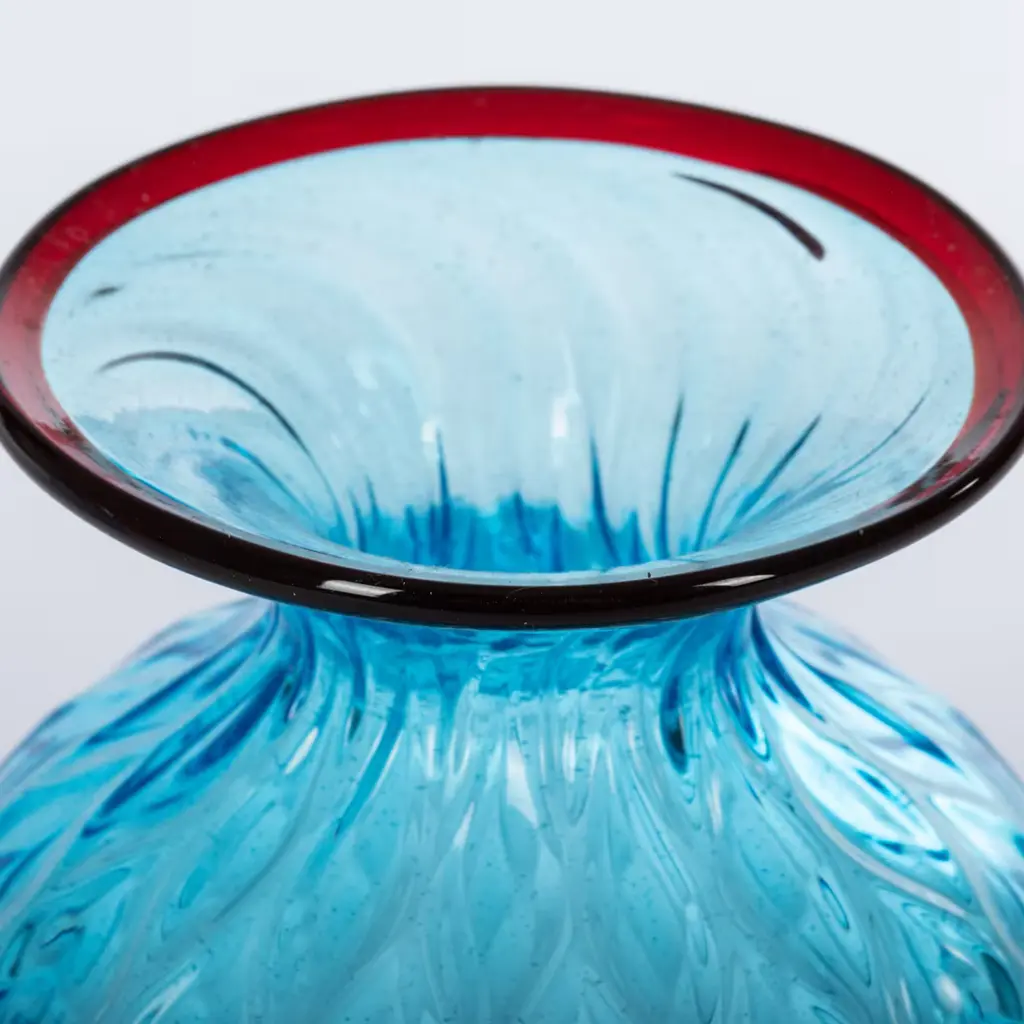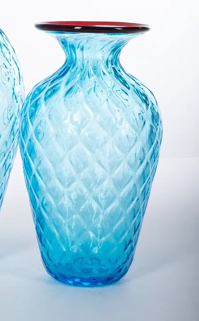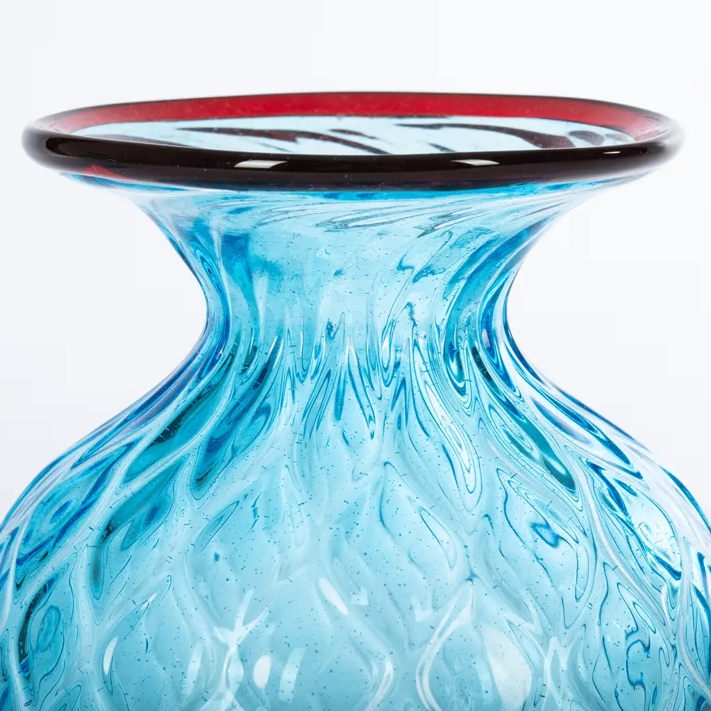 This remarkable vase mouth-blown from light-blue Murano glass embodies centuries of glassblowing tradition within a simple, fresh design that well adapts to modern contexts. Topped by a burgundy rim, the sinuous body boasts an appealing diamond texture obtained with the balloton technique and lends the vase an extraordinary reflective quality allowing it to captivate even as a purely decorative piece.