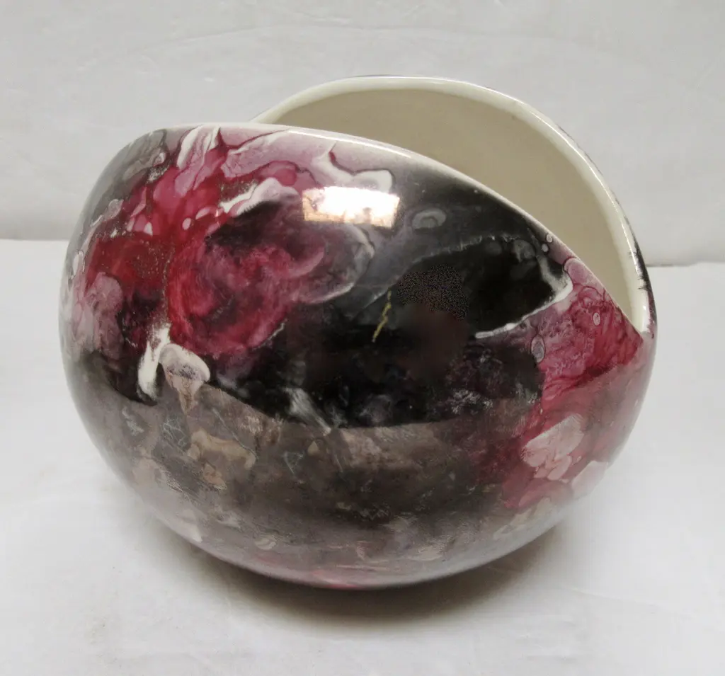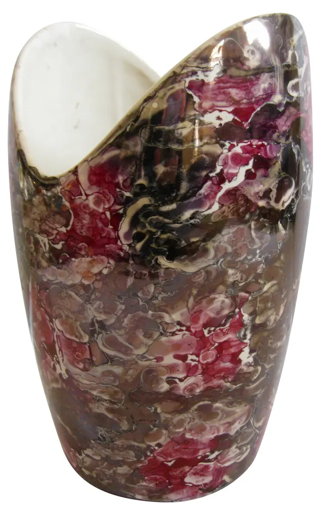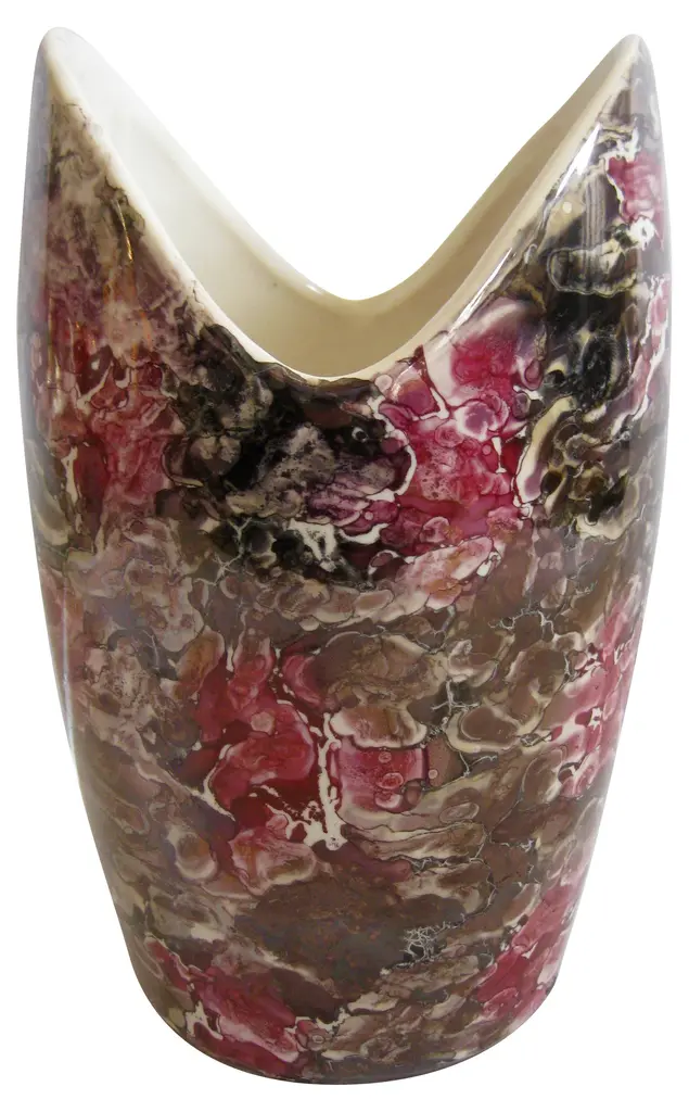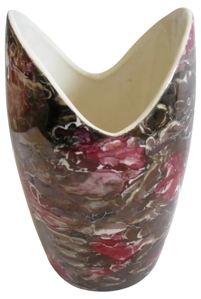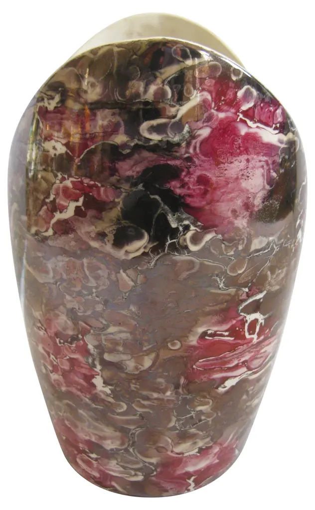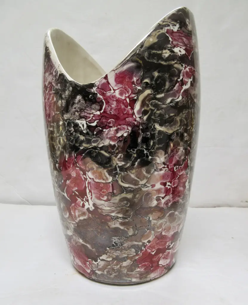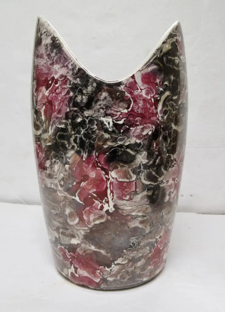 Set of two Mid-Century Modern 1960s McCoy marble-glaze vases with elliptical openings and rich iridescent fuchsia, platinum, silver, gray and white colors. Both vases marked "McCoy U.S.A." Tall vase: 5"D, 9.25"H; second vase: 5"D, 4"H.