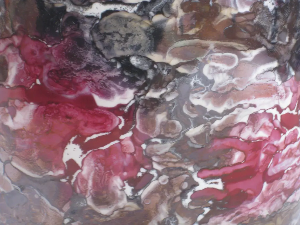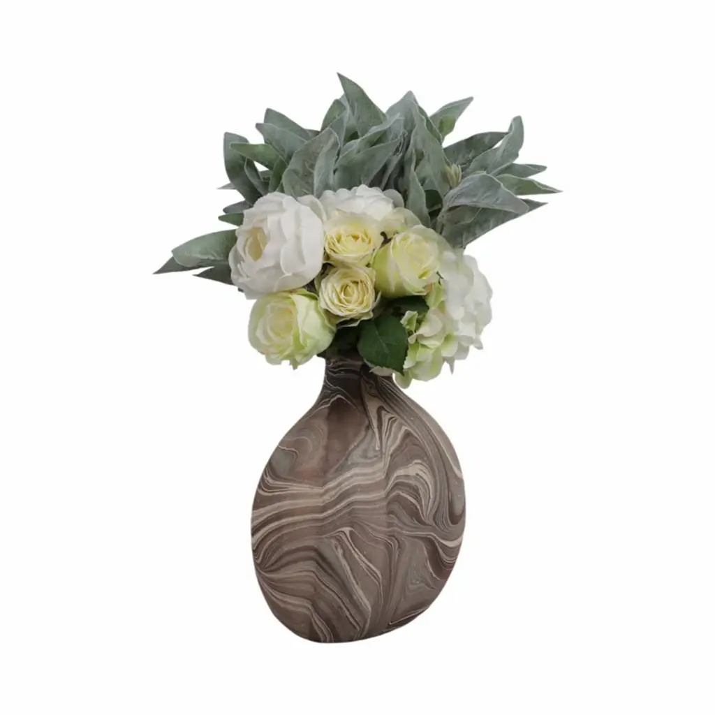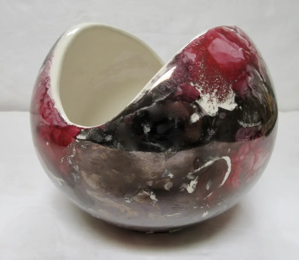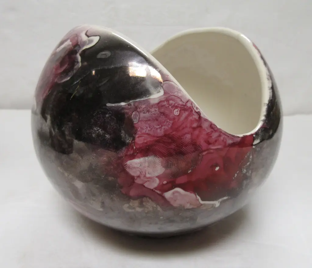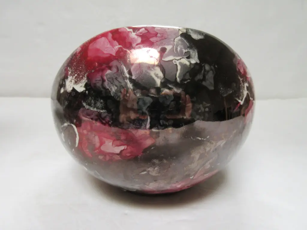 Set of two Mid-Century Modern 1960s McCoy marble-glaze vases with elliptical openings and rich iridescent fuchsia, platinum, silver, gray and white colors. Both vases marked "McCoy U.S.A." Tall vase: 5"D, 9.25"H; second vase: 5"D, 4"H.