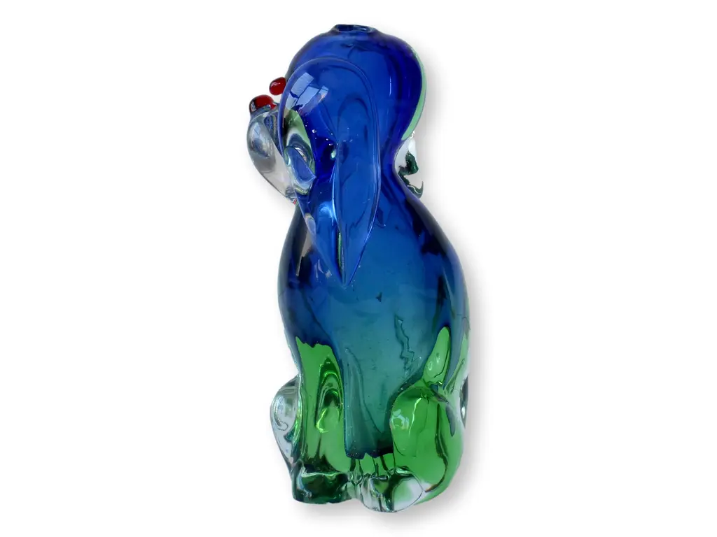 This charming hand-blown Seguso Murano glass dog, crafted in the 1970s, is designed as a stem vase but also doubles as a unique paperweight. The vibrant blend of blue and green hues creates a captivating effect, making this piece a standout addition to any collection. Known for its impeccable craftsmanship, Seguso's work reflects the rich tradition of Murano glass, offering both a playful and sophisticated decorative element for your home. Unsigned.