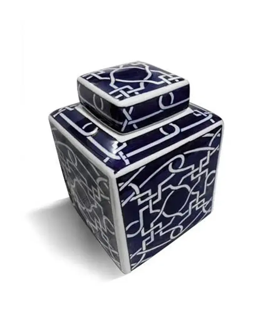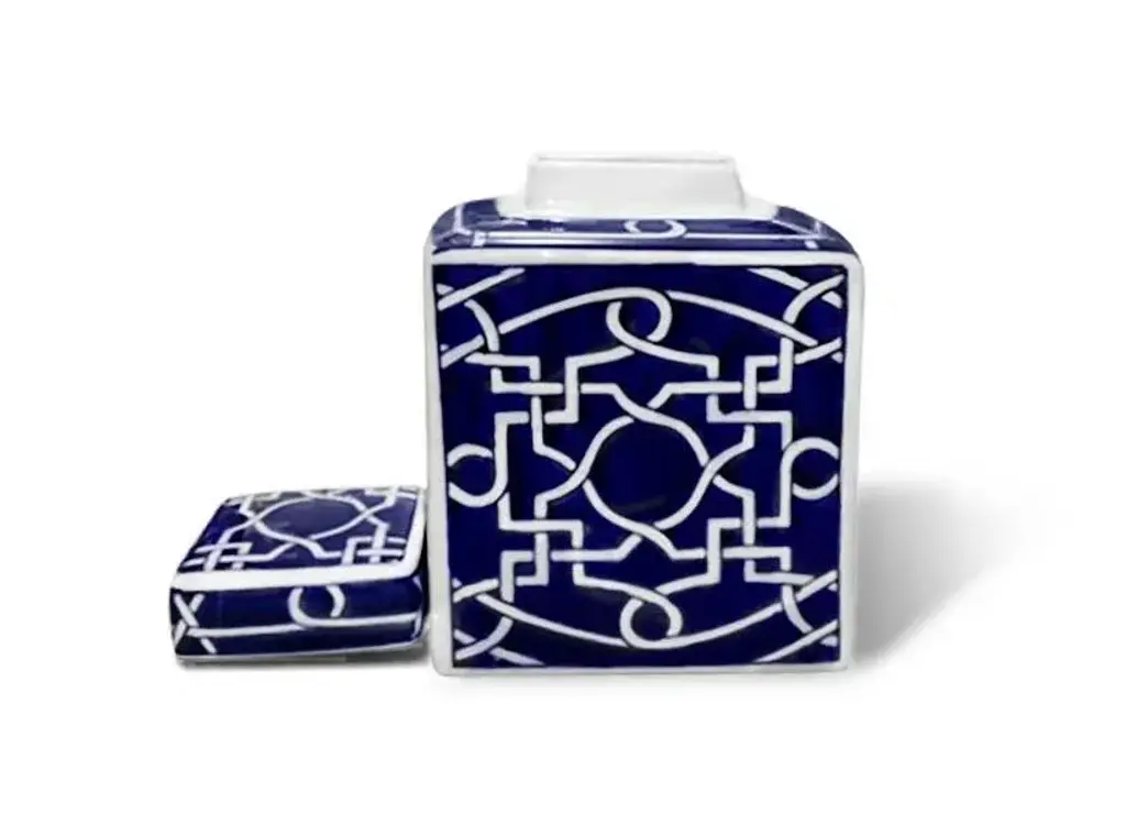 Deep blue and white square vase, abstract white detailing. Glossy finish with a square opening. A great vase to grow a medium sized plant.