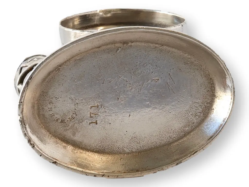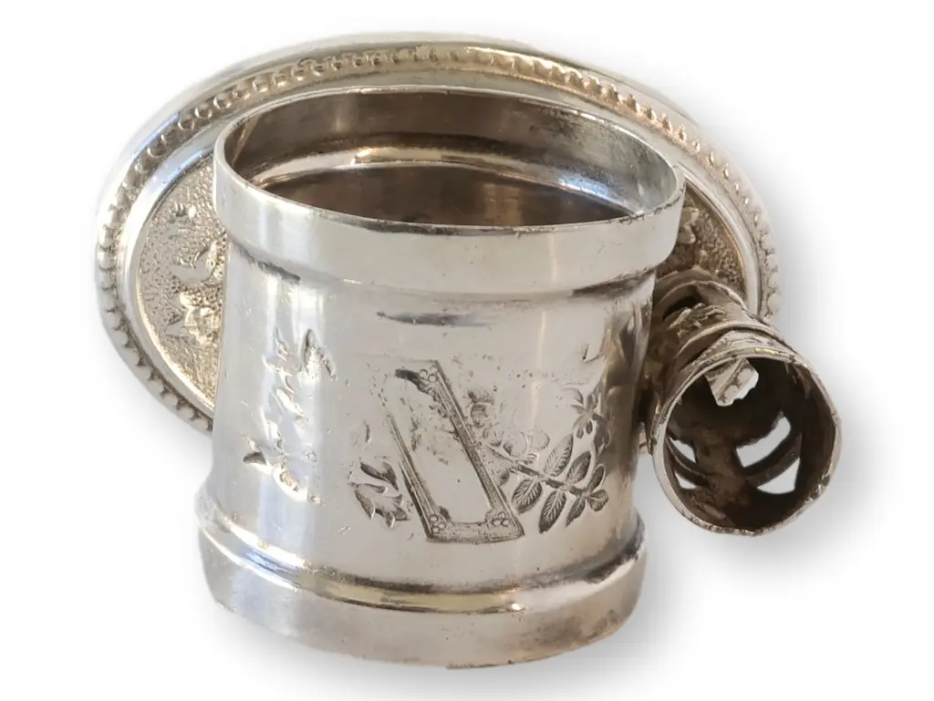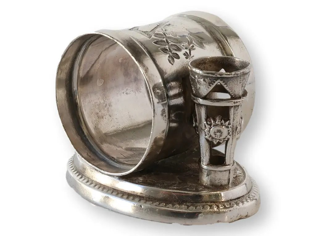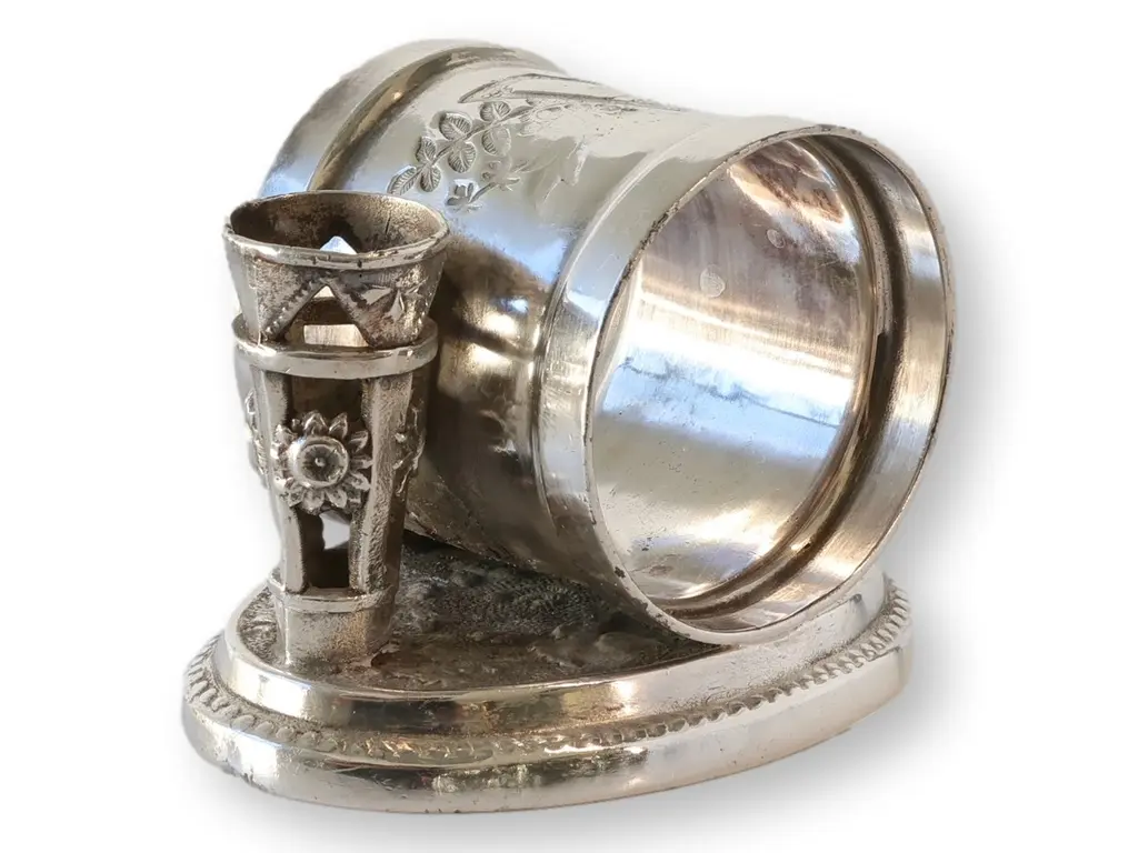 A rare Victorian napkin ring with built-in bud vase holder, crafted by Webster Mfg Co. of Brooklyn, NY. This silver plate beauty features an openwork floral bud vase adorned with sunflower medallions and diamond cutouts, paired with a hand-engraved napkin ring on an oval base. Marked #171, it’s a standout piece of 19th-century American silverplate that blends function, artistry, and charm��perfect for collectors or creative repurposing.