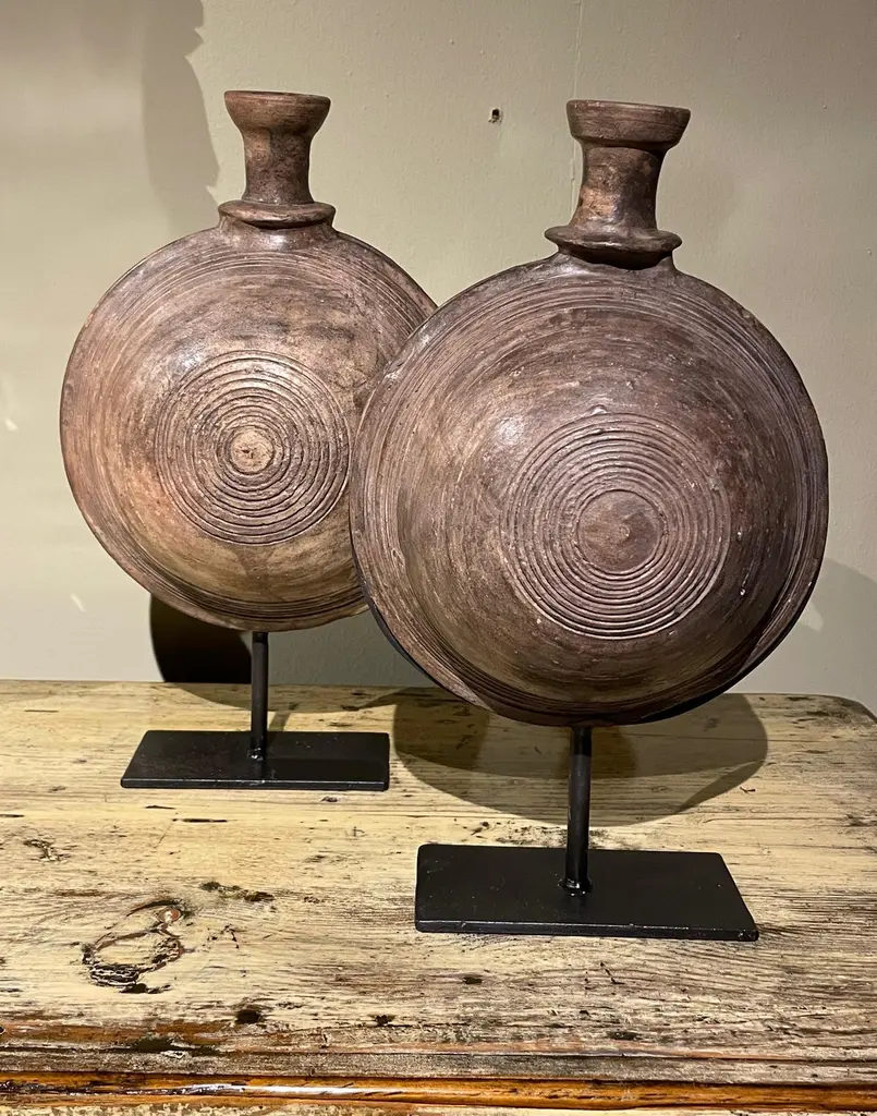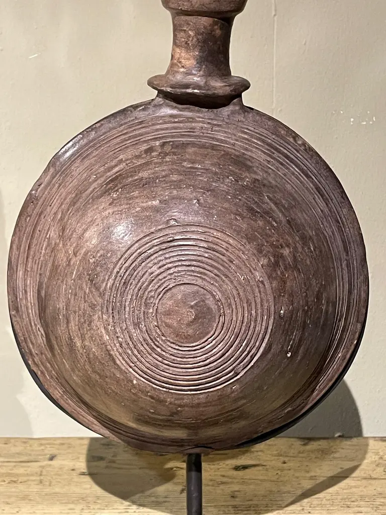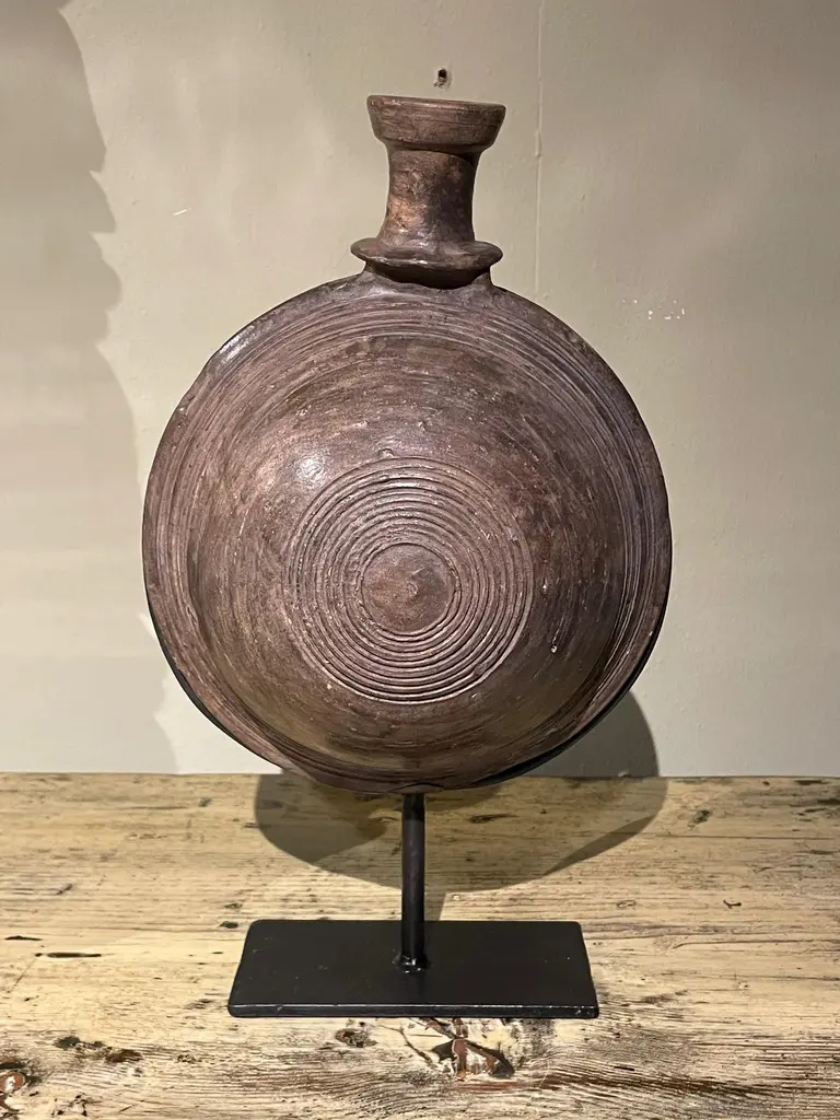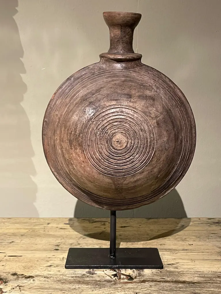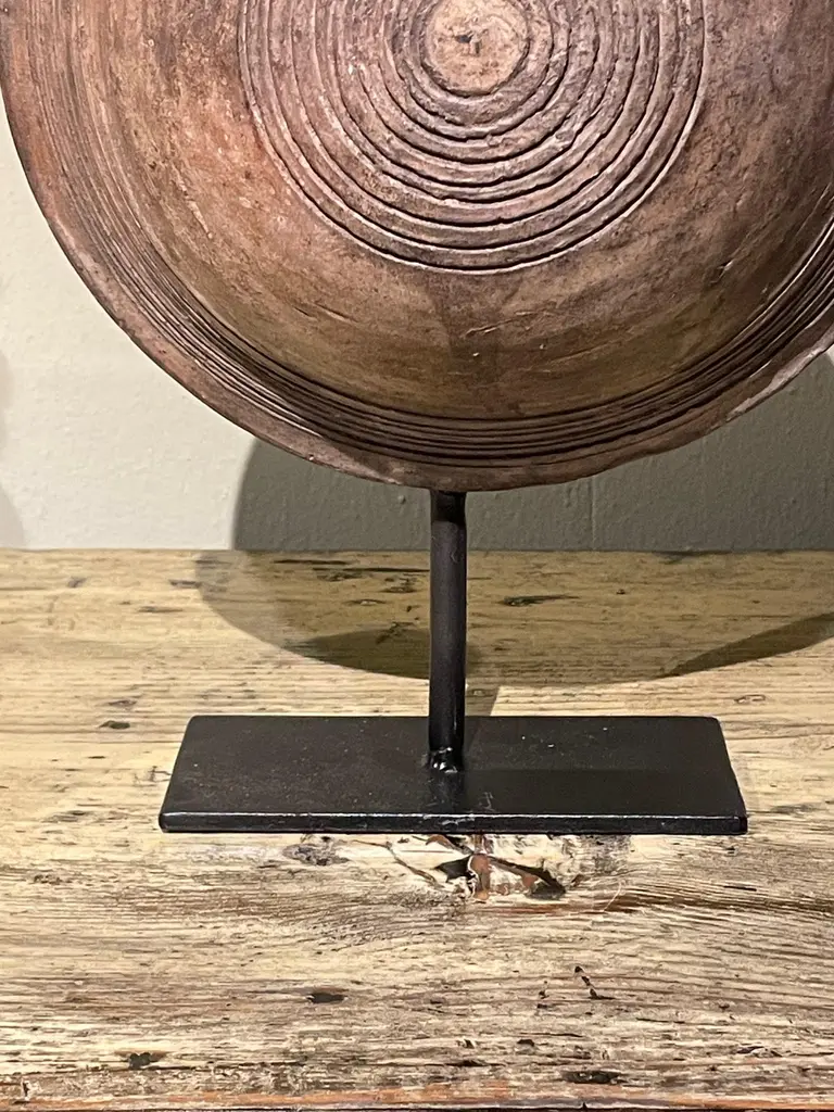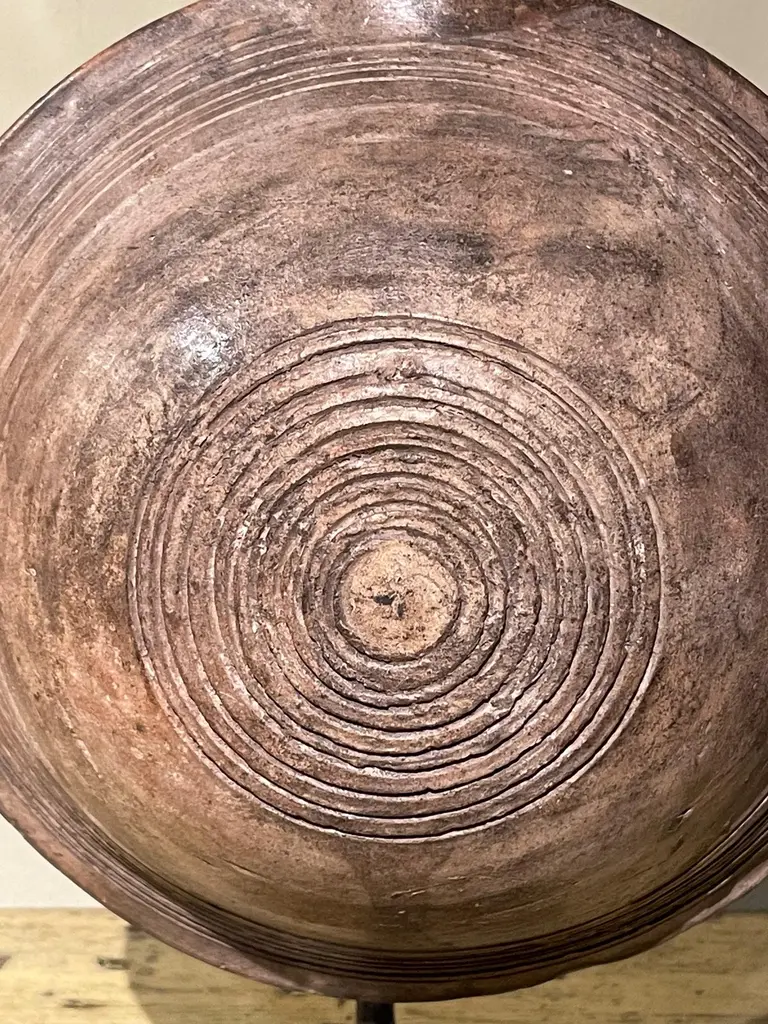 19th century Mongolian wooden vessel on stand.Used to store either water or oil.Engraved circular pattern design.Two available and sold individually.Stand measures 6" x 3"