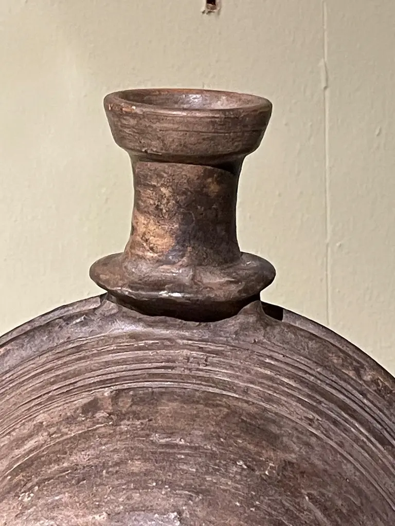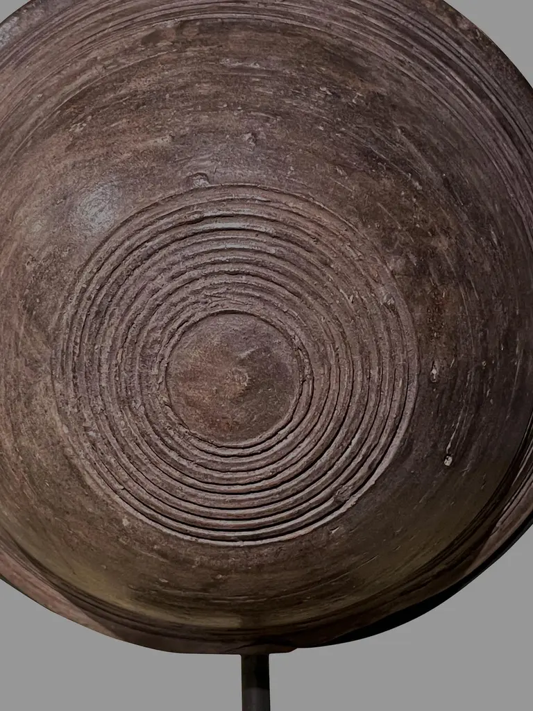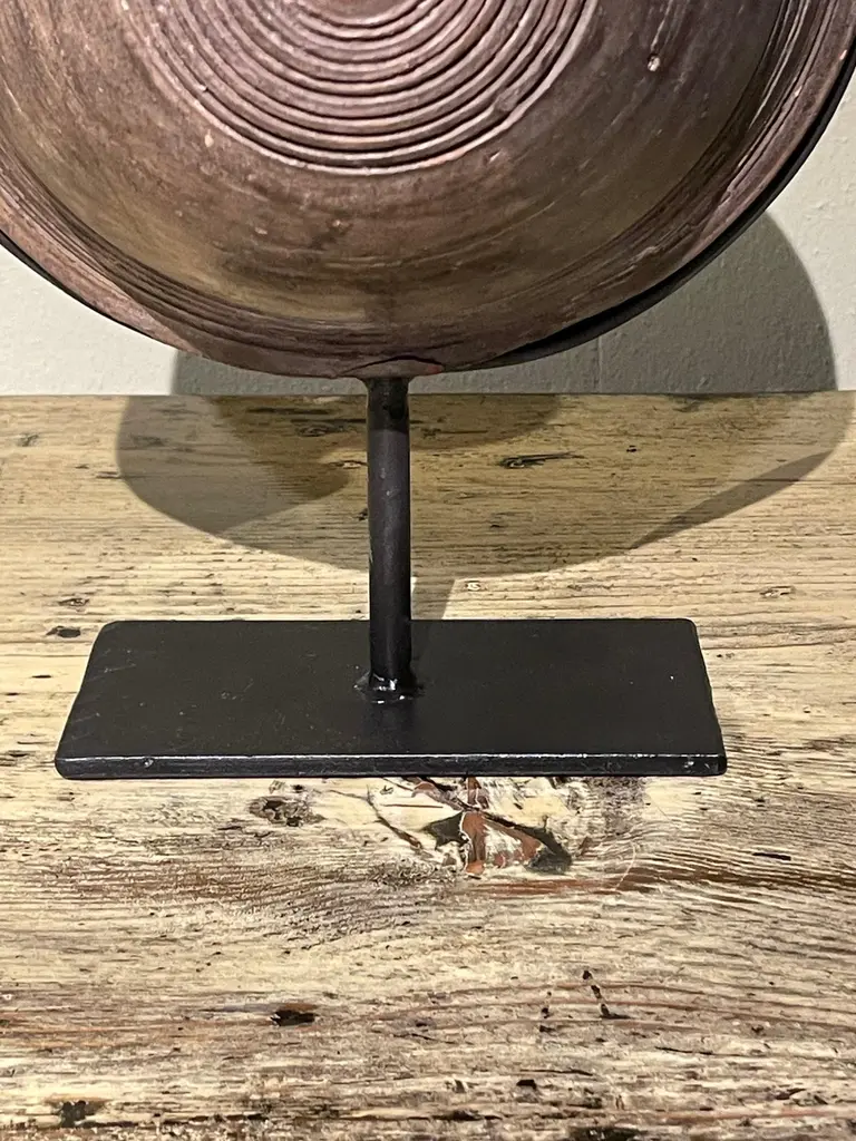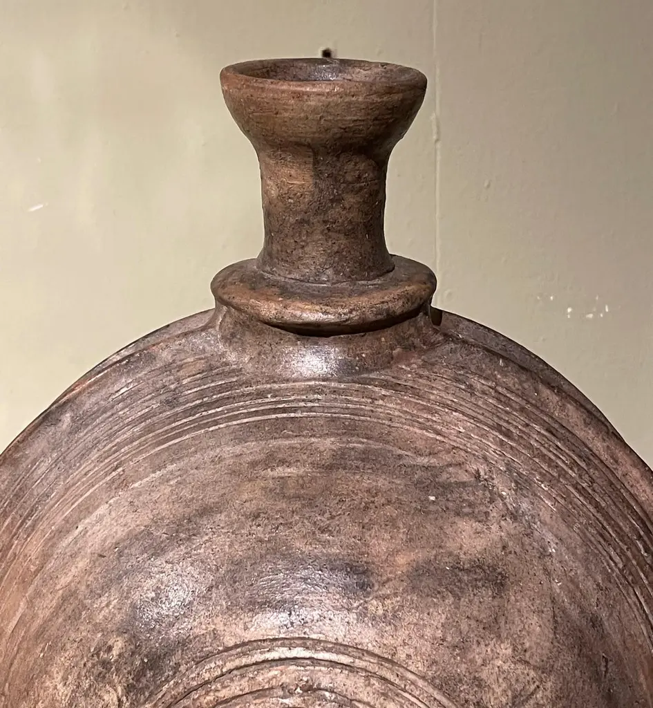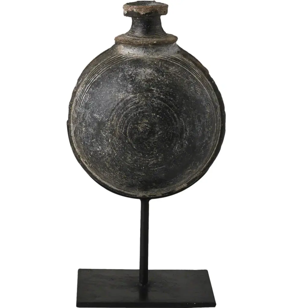 19th century Mongolian wooden vessel on stand.Used to store either water or oil.Engraved circular pattern design.Two available and sold individually.Stand measures 6" x 3"