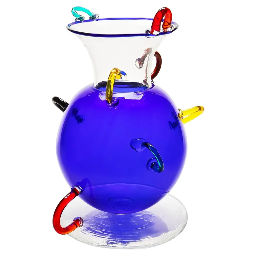 The Fililla Glass Vase is blown glass, with a pendant and was originally designed by Ettore Sottsass in 1986. Signed on the base, for further information please see authenticity info below. Ettore Sottsass was born in Innsbruck in 1917. In 1939 he graduated in architecture at the Politecnico di Torino One of the most influential and important figures of the last century, Architect and Designer, he has participated in all radical movements whether created from the 1970s and 1980s. In 1981 he founded the Memphis group, a group that has radically changed the scenario of Italian and world design. Honored with numerous international awards, was winner of the Golden Compass in 1959. He designed the first laptop "Valentina" by Olivetti. He died in 2007 at the age of 90 years, however Memphis Milano continues and is the representation or Sottsass's great work and memory.Memphis Milano is the great cultural phenomenon of the 1980s that revolutionized creative and commercial logics in design. Born from the idea of Ettore Sottsass and a group of young designers and architects, in Milan, coupled in the years by famous designers from the international scene, Memphis turned upside down all of the existing parameters on living. Ettore Sottsass as the backbone of the group, design gained a new concept and expression through new shapes, materials and patterns, expanding the creative limits of the industry. Memphis became a symbol of New Design. Its influence is still clear in various sectors of production and beyond.Additional info:- Dimensions: H 13.25 inches- Materials: Glass Blown.- Due to the product material and production process, the colors and dimensions for this product may vary.- Pricing: Prices do not include VAT.- Purchased products are shipped with forms of authenticity by Memphis Milano. Glass and Silver items as well, contain an engraving which shows the signature of the designer, and the year which the product was originally designed in.