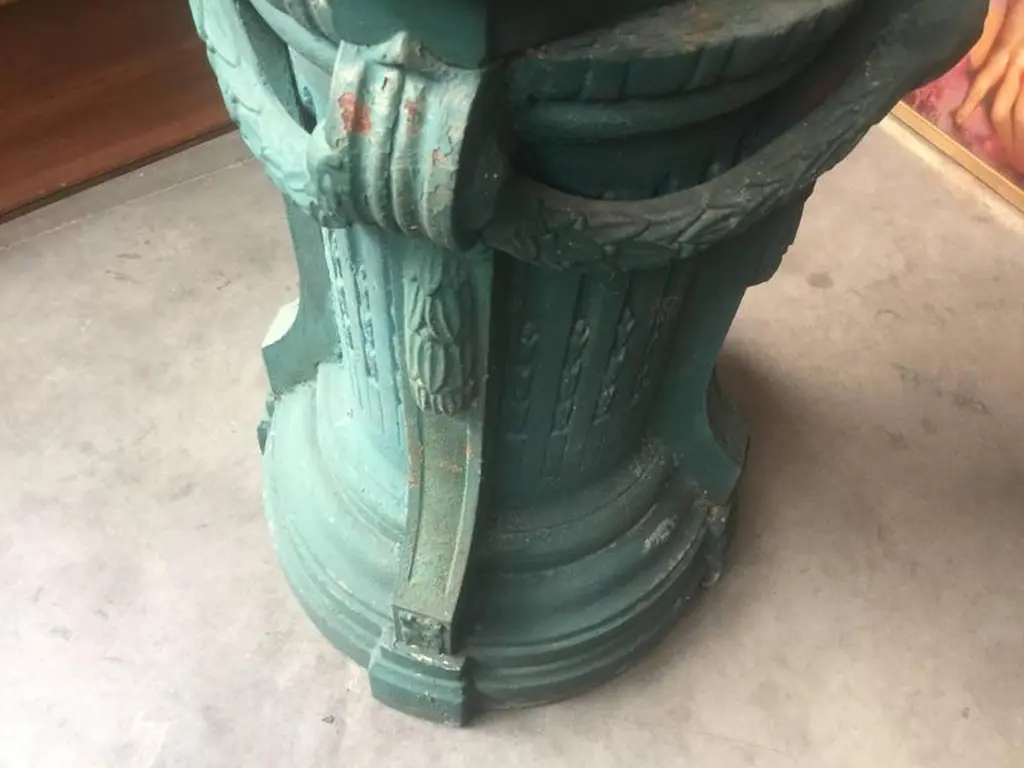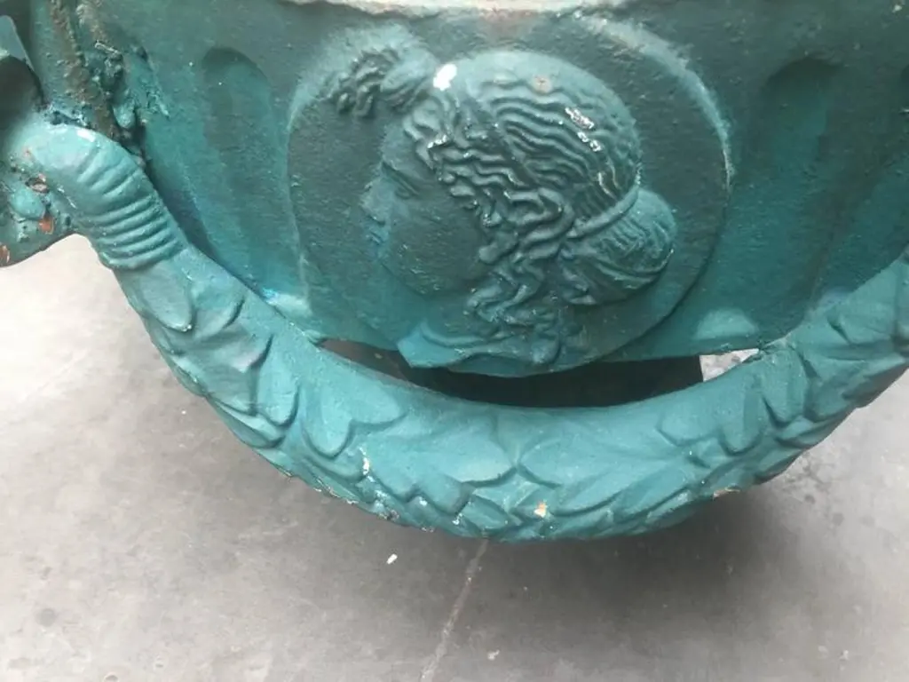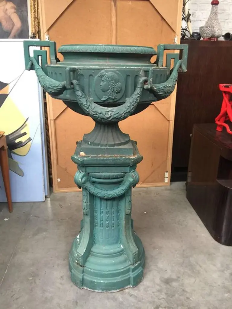 2 Important cast iron garden vases in the style of Louis XVI,end of 19th century. Antique-style vases adorned with female medallions, fluting, Greek-style handles, laurel garlands, on plinths featuring the same decorations. End of the 19th century. Measures: H 143 cm x D 84 cm. Weight around 200kg each.