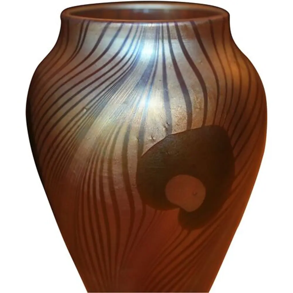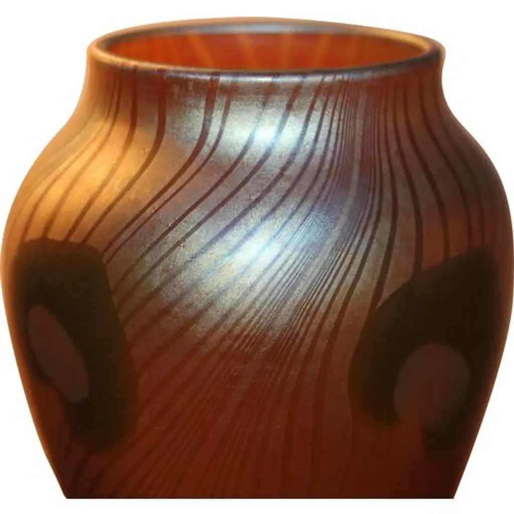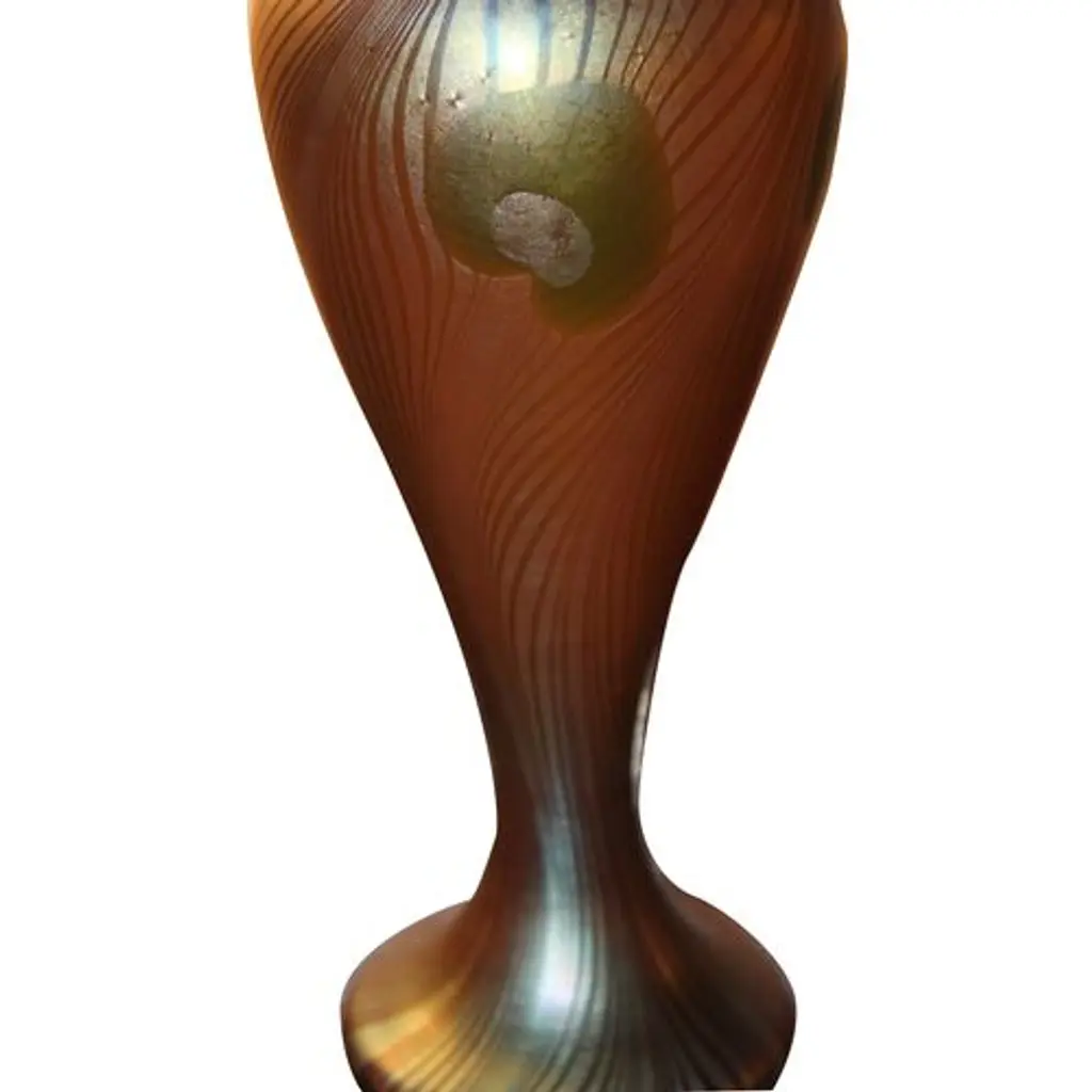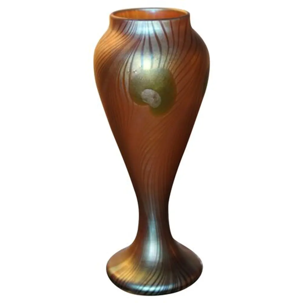 Frederic Carders Steuben Glassworks aurene glass flowers and vines vase, circa 1920. Signed Frederic Carders on underside. There is one stable 1" hairline in the body of the vase (see photos).