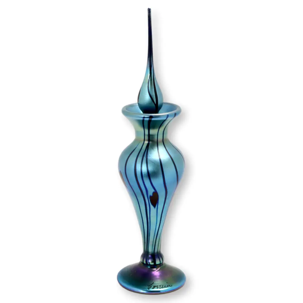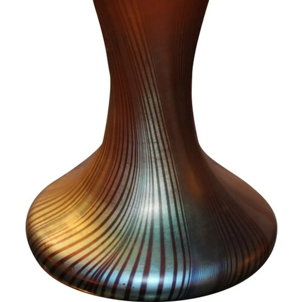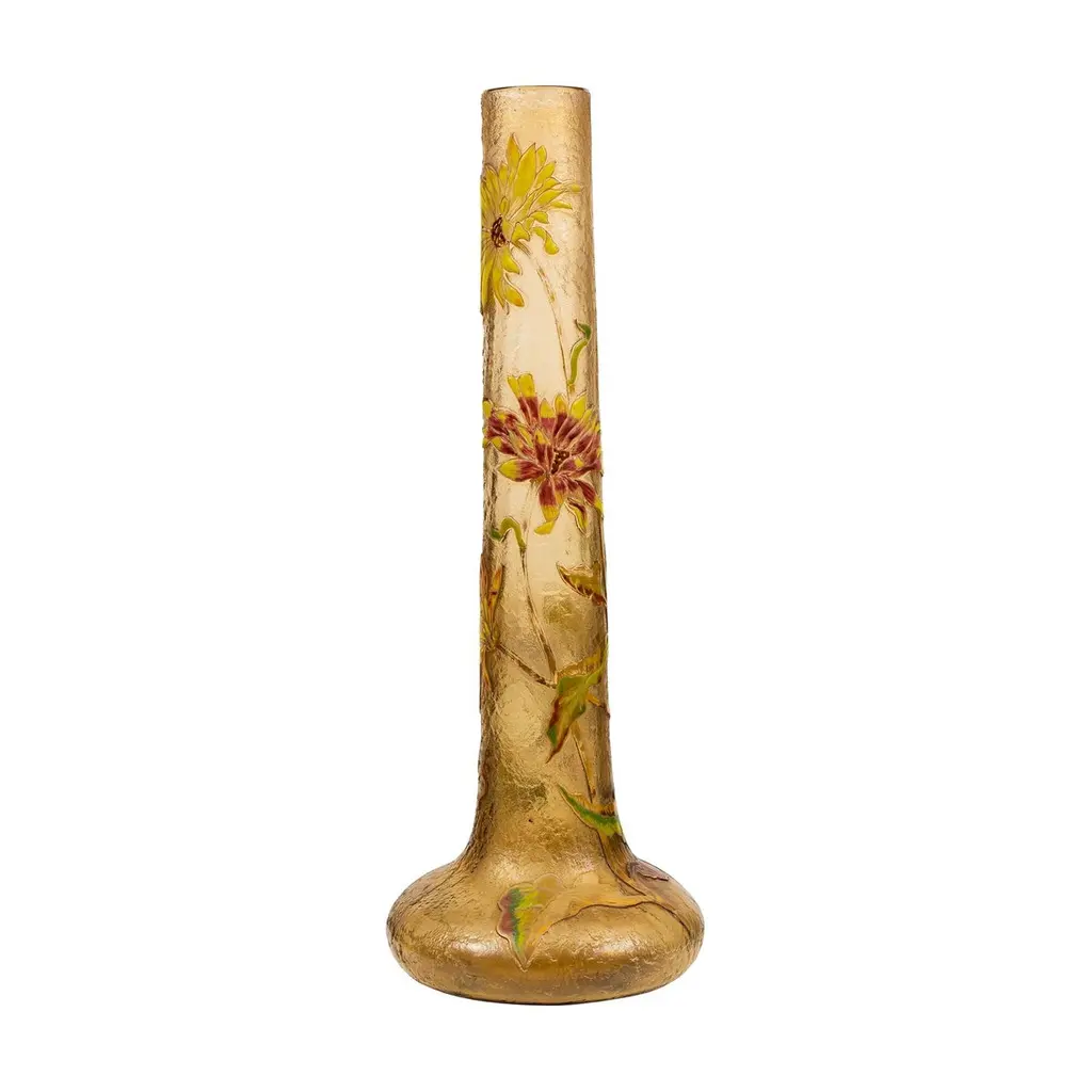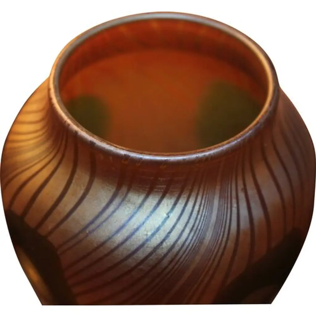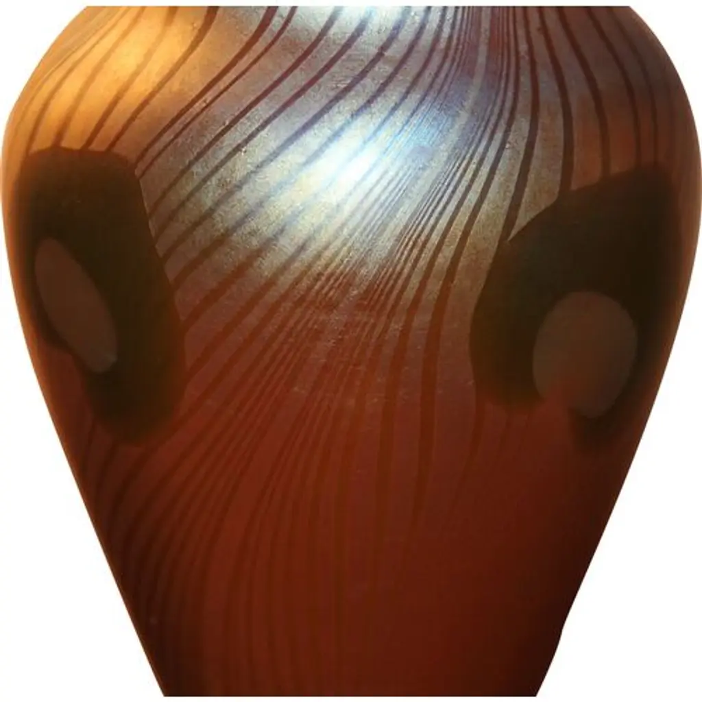 Frederic Carders Steuben Glassworks aurene glass flowers and vines vase, circa 1920. Signed Frederic Carders on underside. There is one stable 1" hairline in the body of the vase (see photos).