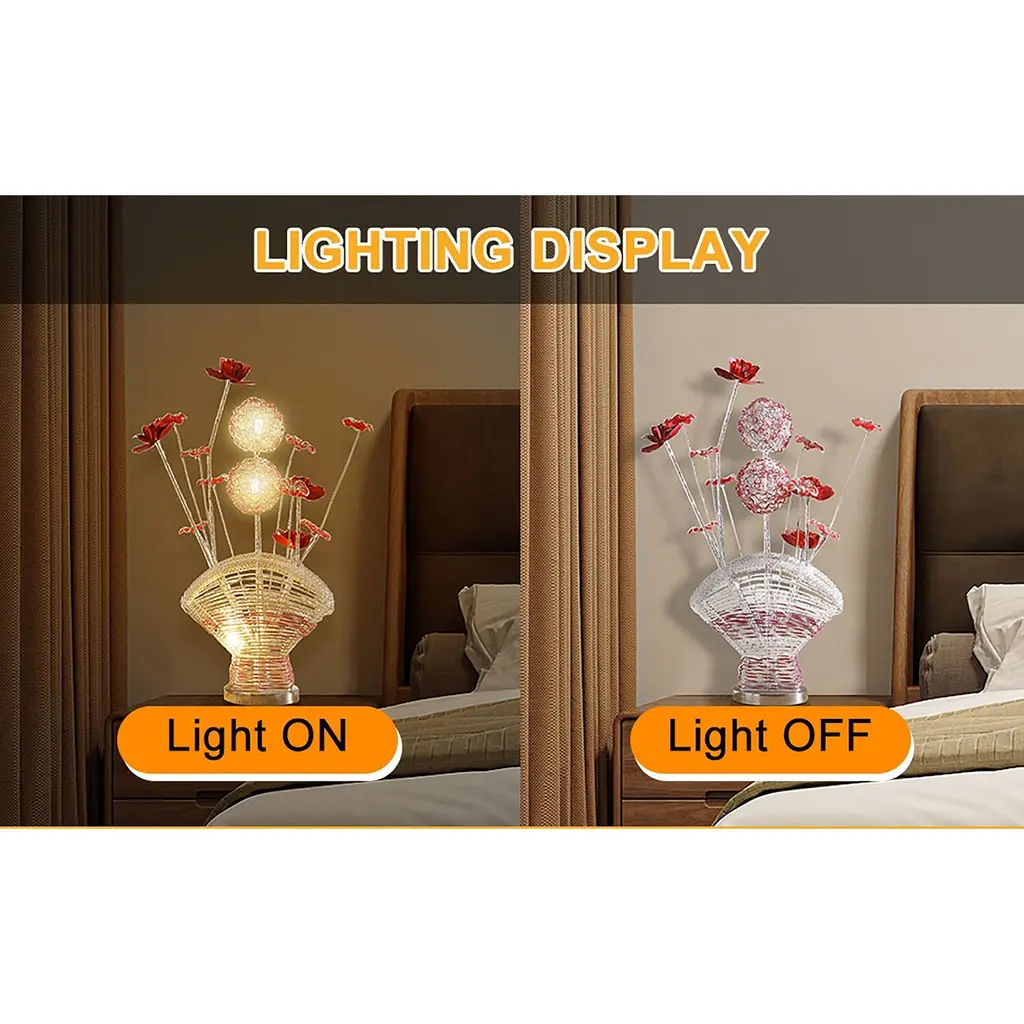 Roses are the most popular flowering plant in the world. Universally understood to symbolize love and passion, red roses are often associated with romance. A deep red rose can represent commitment, while lighter shades convey desire and passion. The grace and majesty of the rose blossom are brought to life in this extraordinary artistic lamp. The rose blooms are finished in aluminum and acrylic materials. Cast aluminum branches, dark red rose acrylic and aluminum flowers, and a luxe aluminum fan vase finish, gives the artistic flower lamp a perfect blend of balance and proportion. The unexpected interplay of materials highlights the essence and simplicity of its organic design.