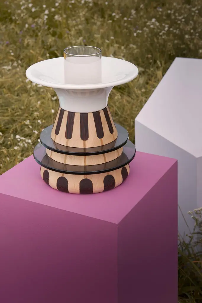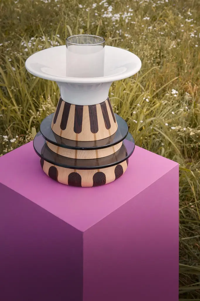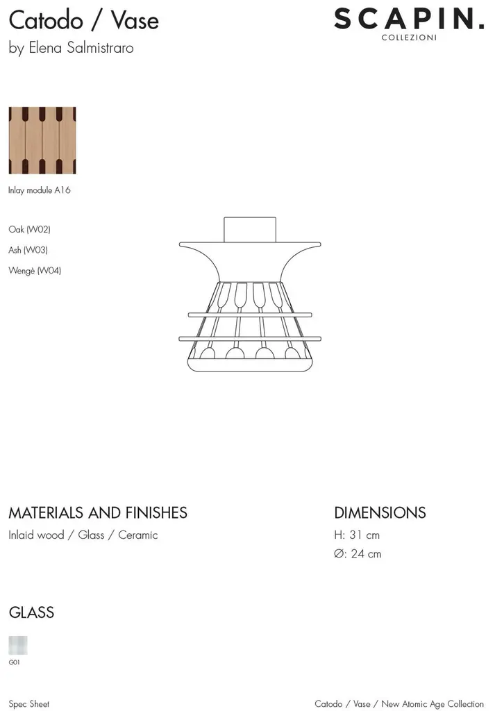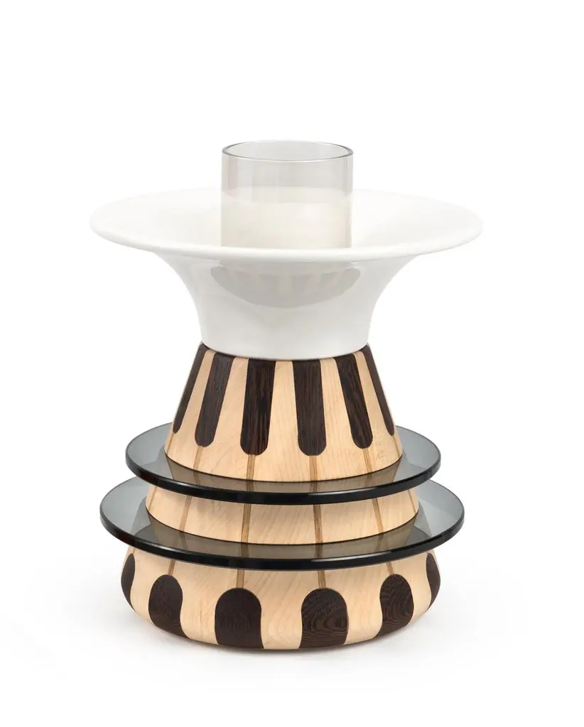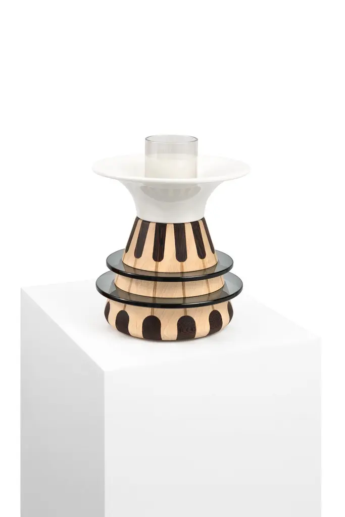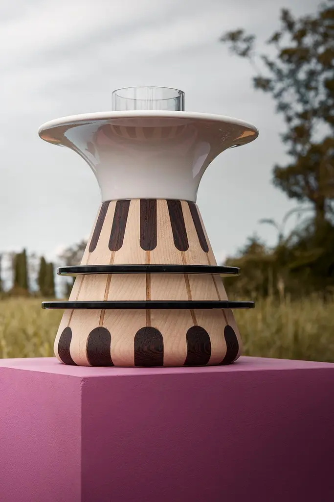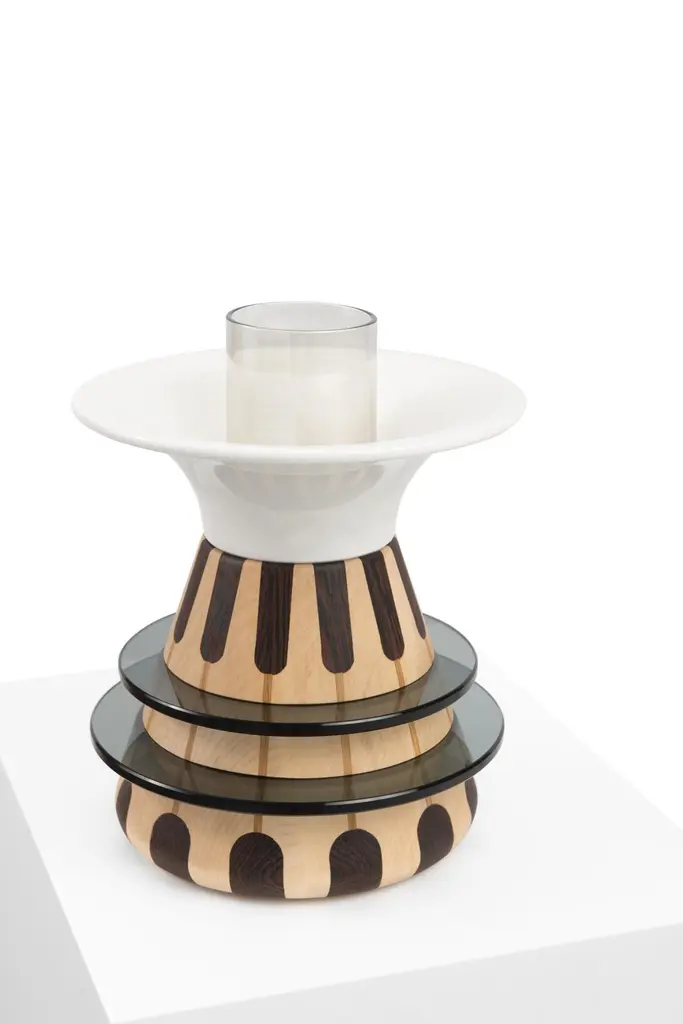 Catodo vase, design by Elena Salmistraro, product by Scapin CollezioniLimited EditionThe design of Catodo arises from an elegant combination of different volumes and materials. A synthetic and yet articulated language is expressed thanks to the encounter of sophisticated wenge, oak and maple inlays, glass and ceramic.Designer and artist Elena Salmistraro takes her inspiration from the historical period between the 1940s and 1960s. During those years the world was a victim of the Cold War and afraid of the imminent nuclear catastrophe, but, despite the scary climate, the public found the strength to imagine a better future.Bold and graphic shapes linked to the fear of the atom were recurrent in the artistic expression of the time as a symbol of the common will to change people’s destiny and defeat the overwhelming sense of fear.The Scapin Collezioni collection by Elena Salmistraro reflects these neo-tribal and post atomic symbols through precious inlays and innovative resin carvings on marble surfaces.