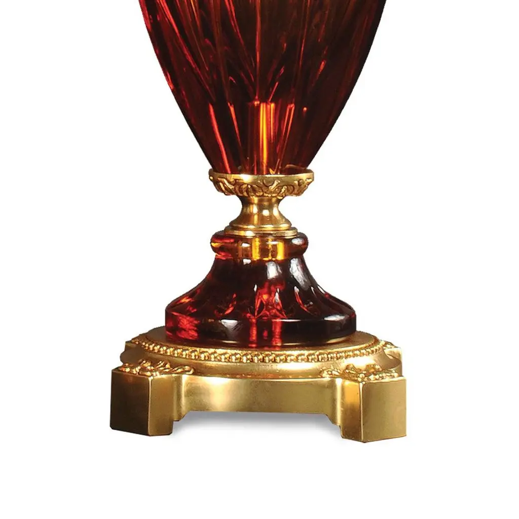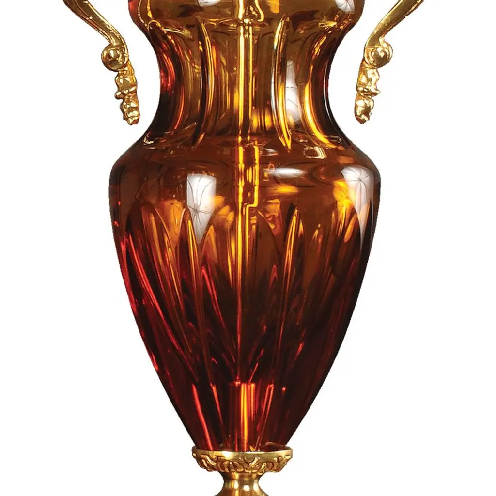 21st Century hand carved amber crystal and golden bronze potiche. This potiche is finely chiseled lost wax castings and hand ground crystal. On request to customer can modificate the color of crystal: pink, amber, amethist etc... and we can change also the metal finishing: French gold, burnished, dark burnished, antique silver and patinated gold so you can match it with any decor. The style of this vase is classic and can be inserted in the best possible way within every furniture.Each object is handcrafted and the care for every detail makes each item unique in its kind.Also Oggetti d'Arte will follow with the same passion the request of the most qualified studies of interior architecture from around the world, helping them in achievement of their most ambitious projects.