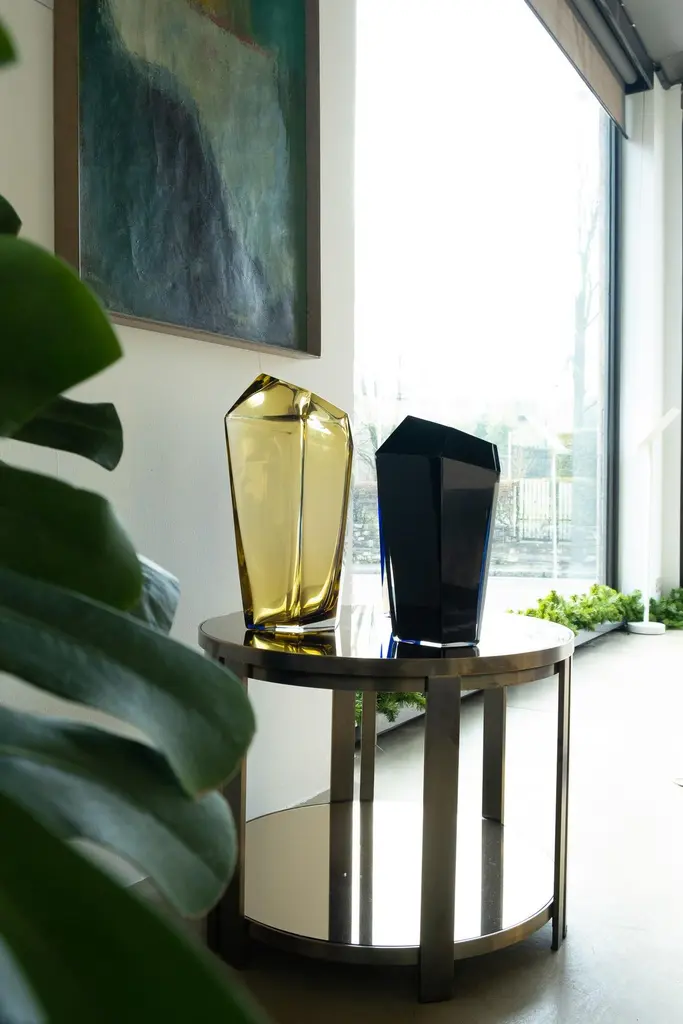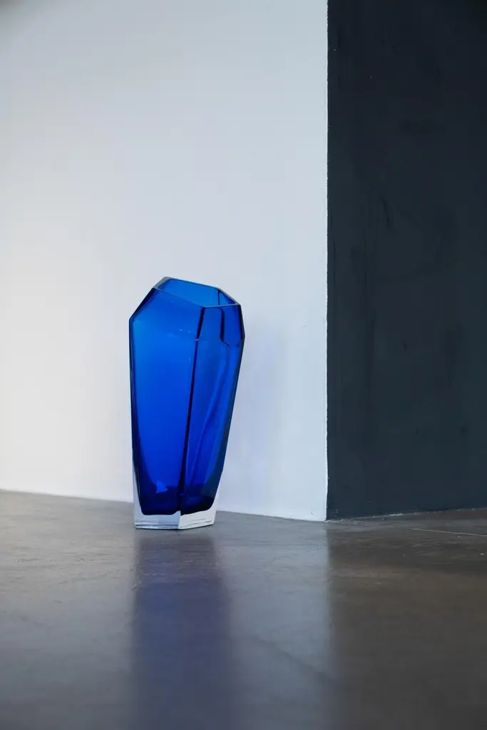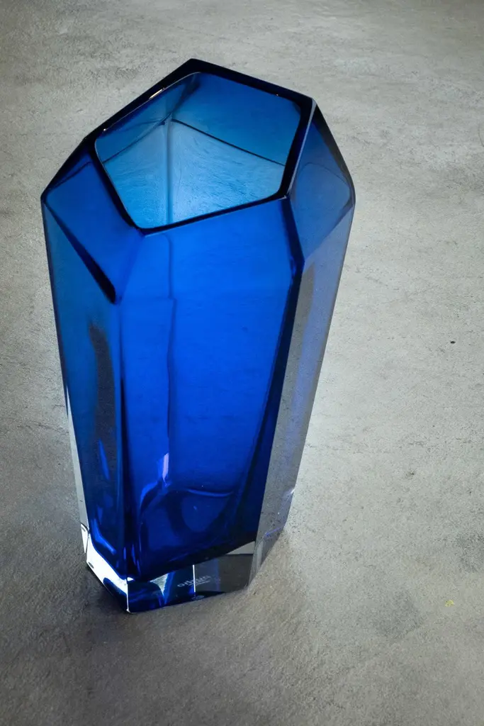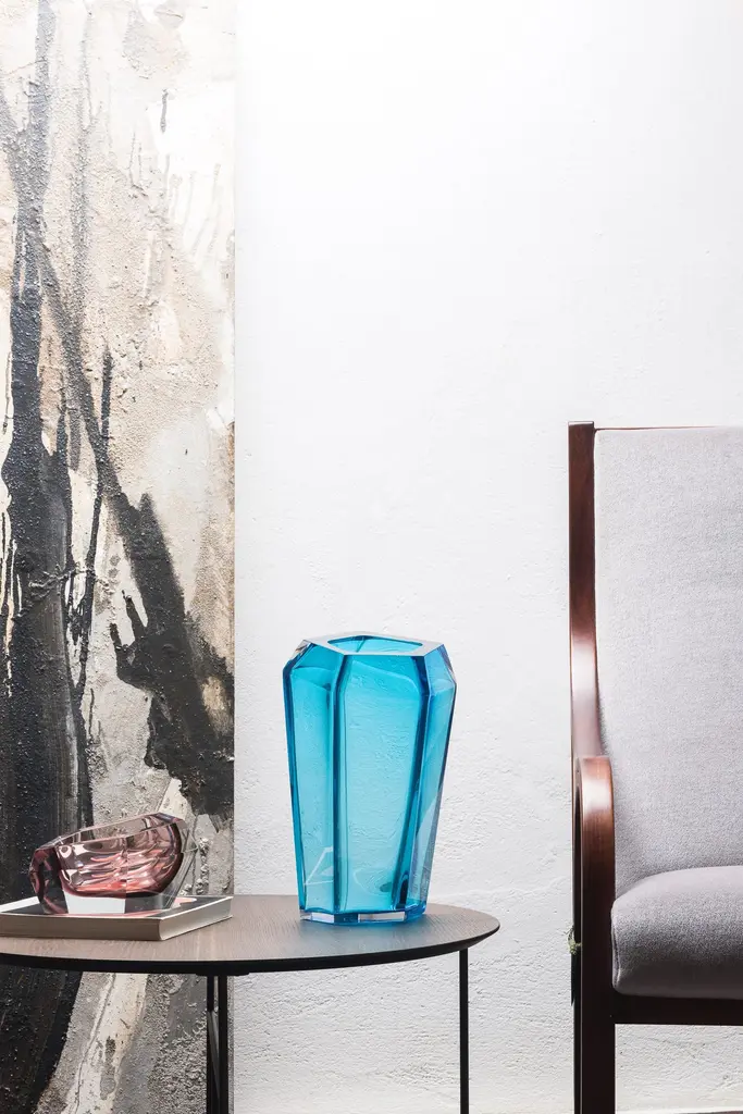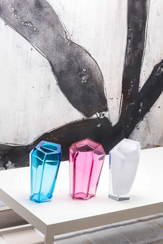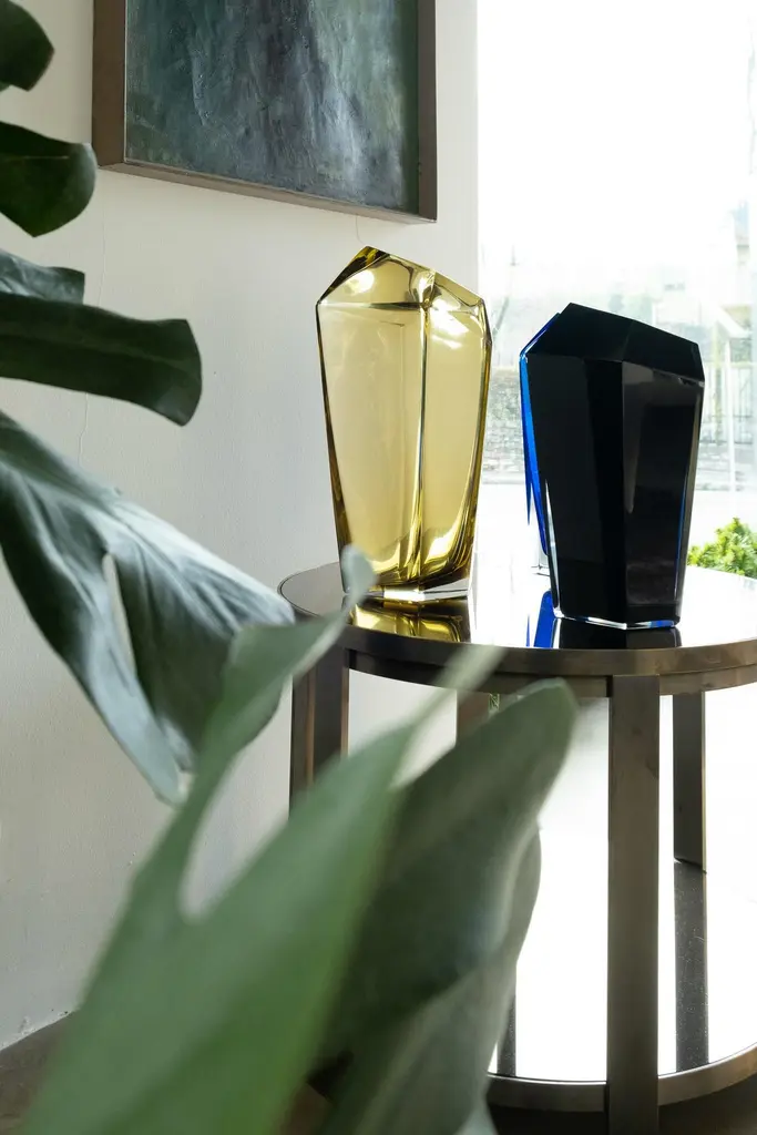 Kastle vase, Murano glass, by Karim Rashid, 21st century.Karim Rashid has conceived for Purho a mini collection of bowls and vases characterized by their faceted, structural form and abstract elegance. Irresistible because of the unusual and geometrical surfaces and bold colors, Kastle are available in different sizes offering a wide range of uses. Kastle are made of Murano glass although mirror finish is available only on request.Murano Glass is available in 21 finishes and customized version.Available colors:Transparent Blown glass 01. ice crystal 02. milky white 03. honey 04. ruby venice 05. amethist pink 06. coffee 07. amber yellow 08. capri yellow 09. mandarin orange 10. oriental red 11. green apple 12. caribbean green 13. green lagoon 14. emerald green 15. blue mediterranean 16. peacock blue 17. ocean blue 18. florence purple 19. london grey 20. black gondola Special processing techniques 21. gold leaf.