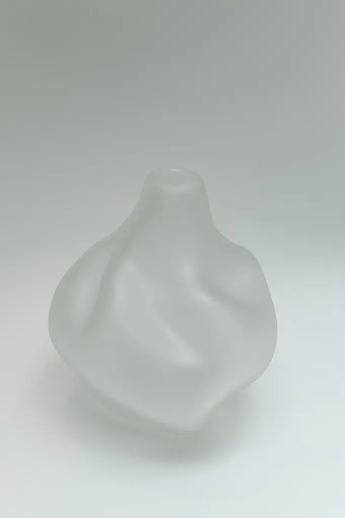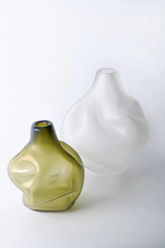 Caigo is a vase from the Laguna Collection designed by Ludovica+Roberto Palomba for Purho in spring 2022. Characterized by large volumes in contrast to the small upper mouth — suitable to accommodate even a single flower — Caigo, which name refers to the thick fog in the Venetian dialect, recalls the soft and folded shapes of a bag emptied of its contents. Thus the folds of the fabric become glass hollows and curves reflecting the creative dialogue between the designers and the master. Made of Murano glass in iridescent colours and sandblasted finishes, Caigo Small and Caigo — the bigger version — complete the other artefacts of the Laguna Collection: a composite set of organic forms, apparently imperfect cylinders, in which the formal flow is interrupted only by the engraving on two of the vases. A departure for a collection that is a tribute to Murano and the lagoon that surrounds it.Available colours: Steel grey, moss green, deep blue, crystal and topaz.