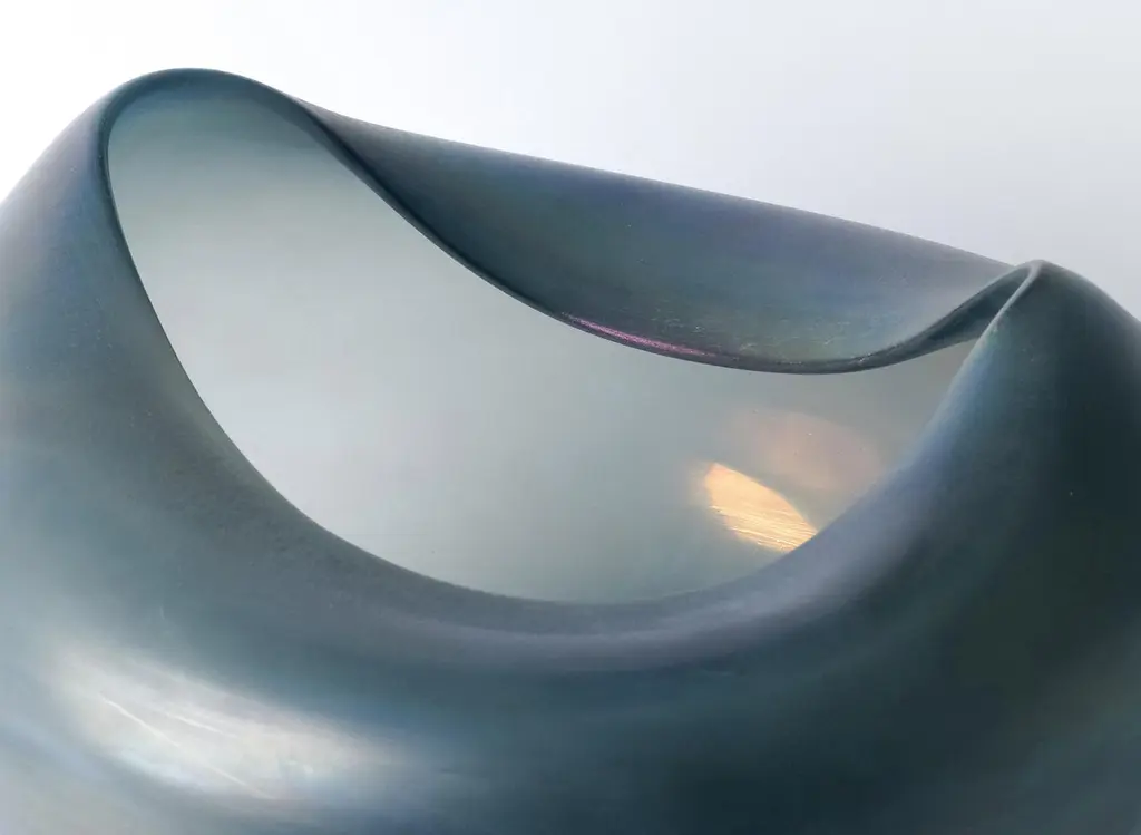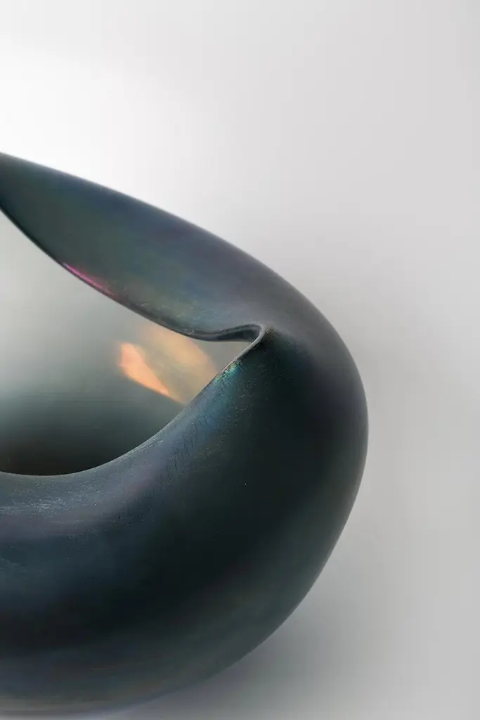 Ghebo is a bowl from the Laguna Collection designed by Ludovica+Roberto Palomba for Purho in spring 2022.Large volumes and wavy profiles characterize this vessel which name — Ghebo — refers to the minor canals that cross the emerging shoals (barene) and mudflats of the Venetian lagoon. Made of Murano glass in iridescent colours and sandblasted finishes, Ghebo completes the other artefacts of the Laguna Collection: a composite set of organic forms, apparently imperfect cylinders, lavish bags which fold onto themselves, in which the formal flow is interrupted only by the engraving on two of the vases. A departure for a collection that is a tribute to Murano and the lagoon that surrounds it.Available colours: Steel grey, moss green, deep blue, crystal and topaz.