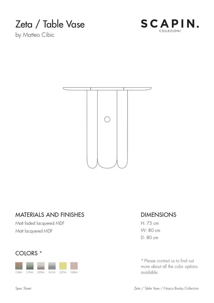 Zeta vase/table, design by Matteo Cibic, product by Scapin CollezioniZeta is the result of an harmonious and elegant combination between a table and a vase. A successful example of a twofold purpose product. Two monochrome finishes - lemon yellow with dark grey metal details and pale pinkwith golden metal details - are added to the shaded version in the ZETA vase-table collection. The new colours add a refined touch to interior spaces, with the lightness characterising the entire collection.Materials: Matt lacquered MDF.Nazca Booby Collection by Matteo CibicWorking with colors and their juxtapositions, Matteo Cibic has created a truly outstanding universe of unique and sophisticated pieces. While designing the collection, he took his inspiration from the slender and faded paws of the Nazca Booby, a particular South American specie of birds. The search for ancient mysteries, shapes and animals coming from remote and mysterious lands, inspired Cibic to create a collection that stands out for the lightness of its elements and for the unique use of faded lacquered surfaces.