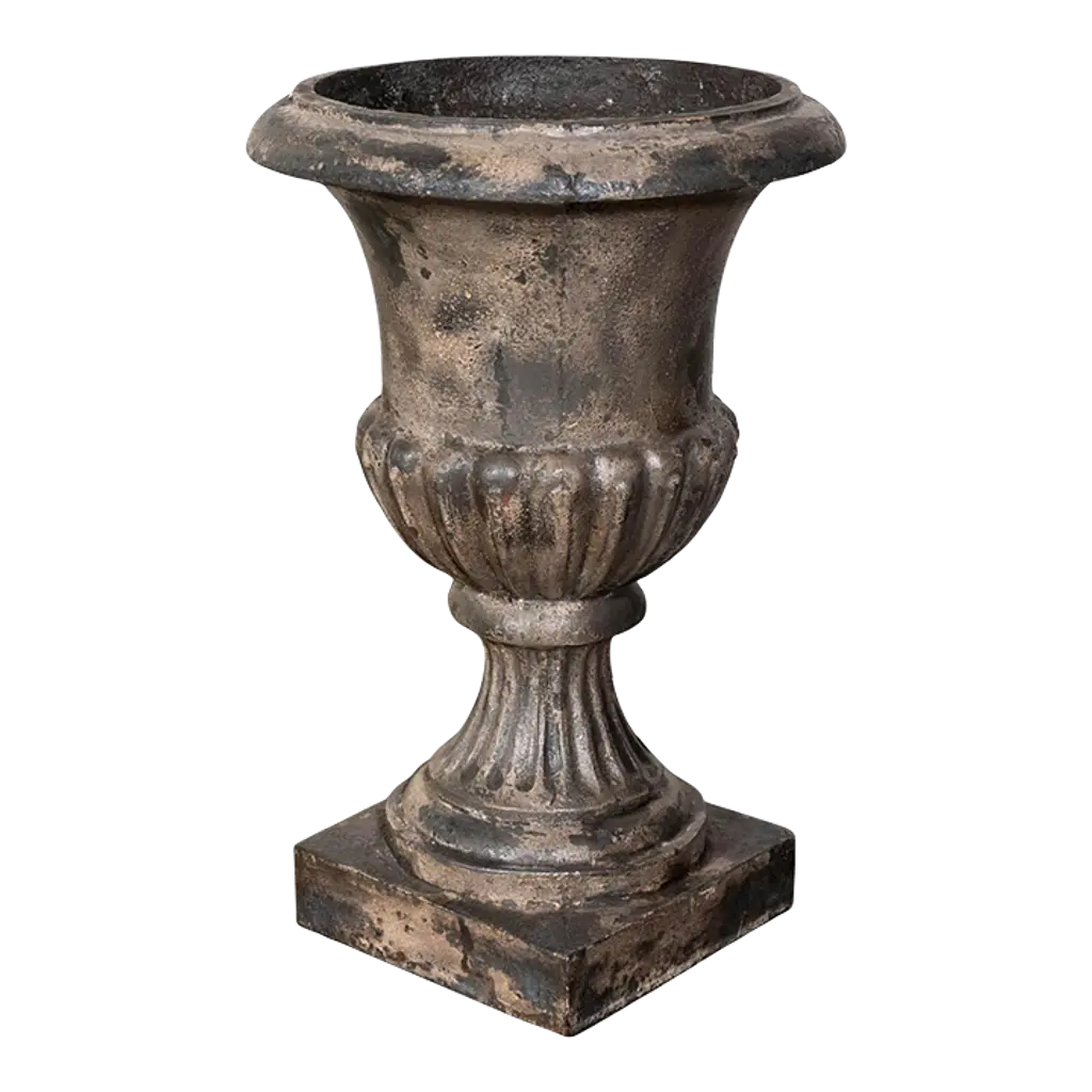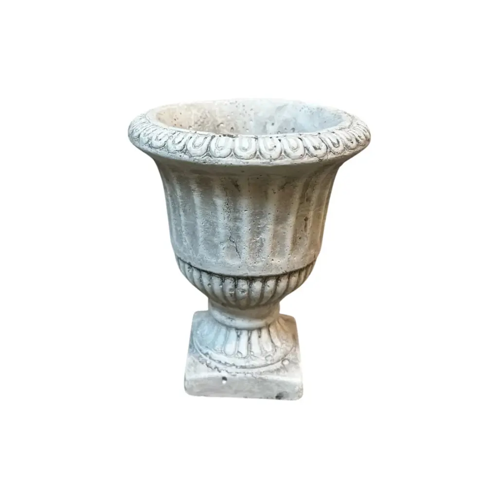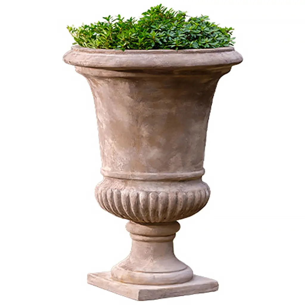 A mossy green finish lends this urn the look of a weathered antique. Crafted of Fiber Stone, in which sand and pebbles are cast into fiberglass to create the appearance of aged stone, it weighs much less than stone and is more durable than concrete. Made in the USA.