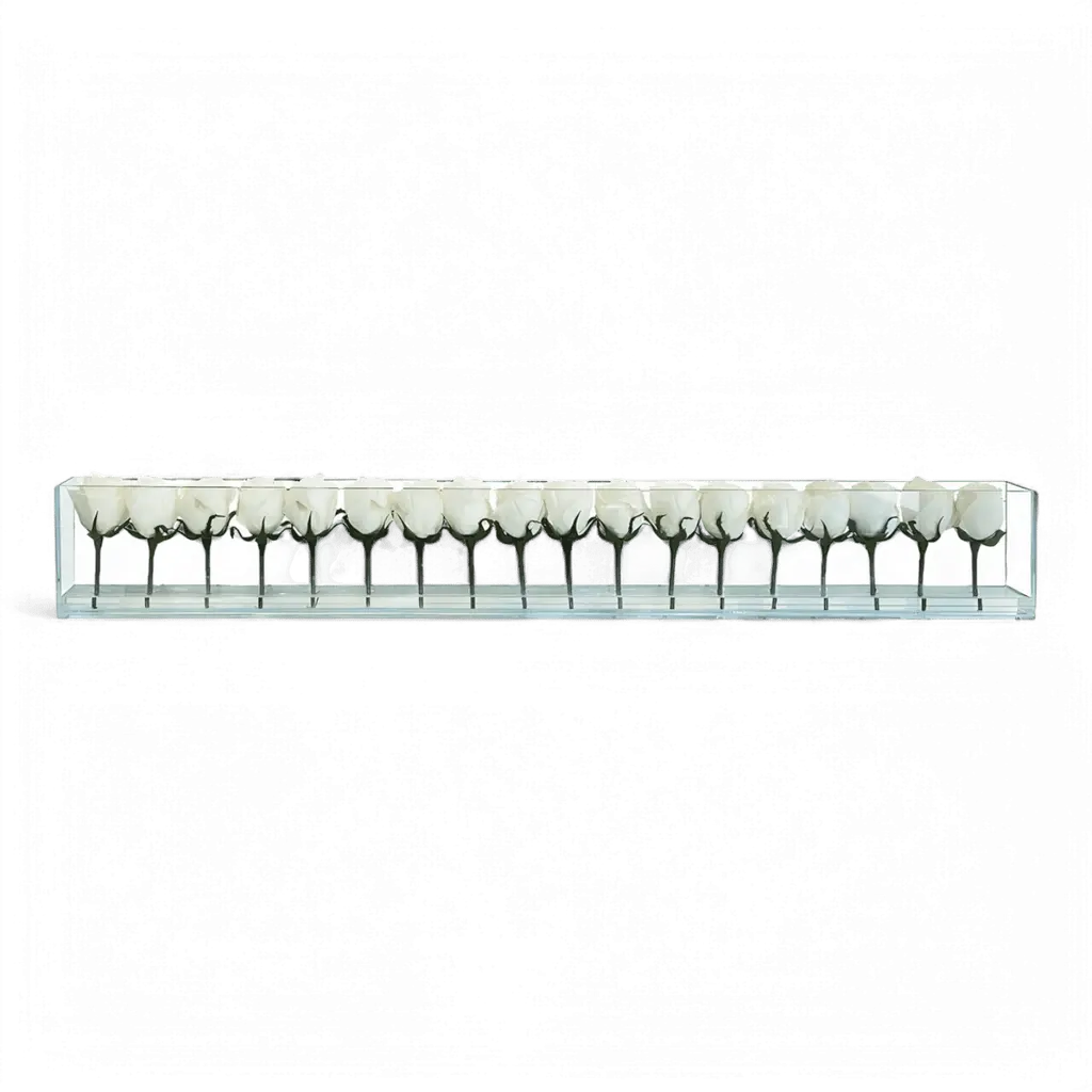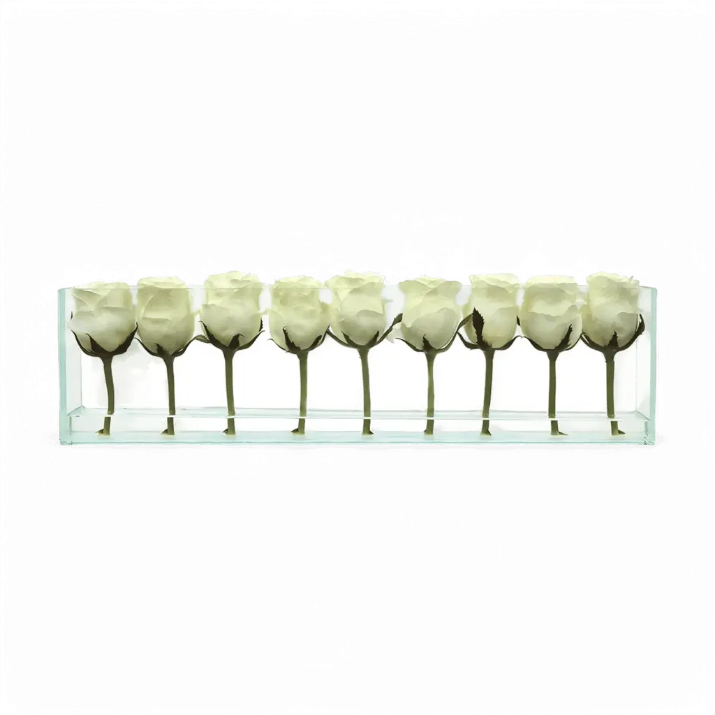 White Roses are the perfect finishing touch to elevate any room. We've imagined a unique spin on the classic bouquet, presenting beautiful close-cropped blooms in a linear display. Each flower is stunningly showcased within a contemporary rectangular glass vase. Also available in red roses.Glass Vase | Real Touch Silk Flowers