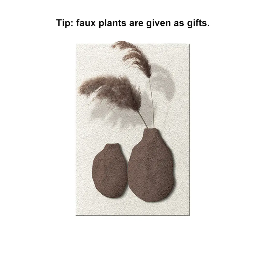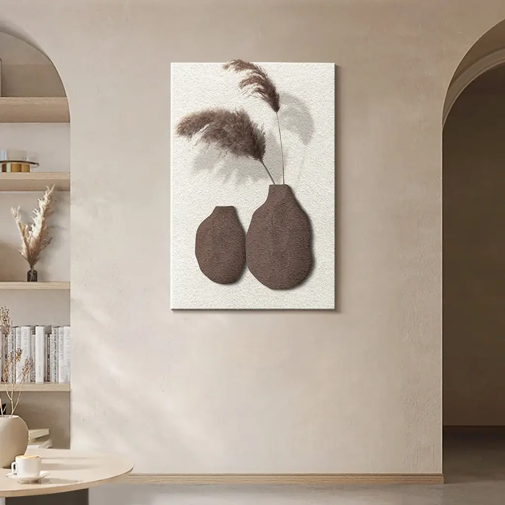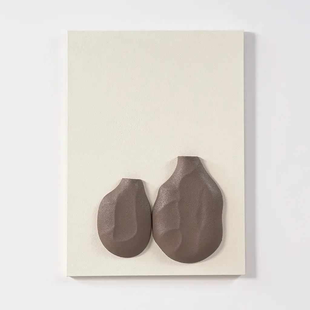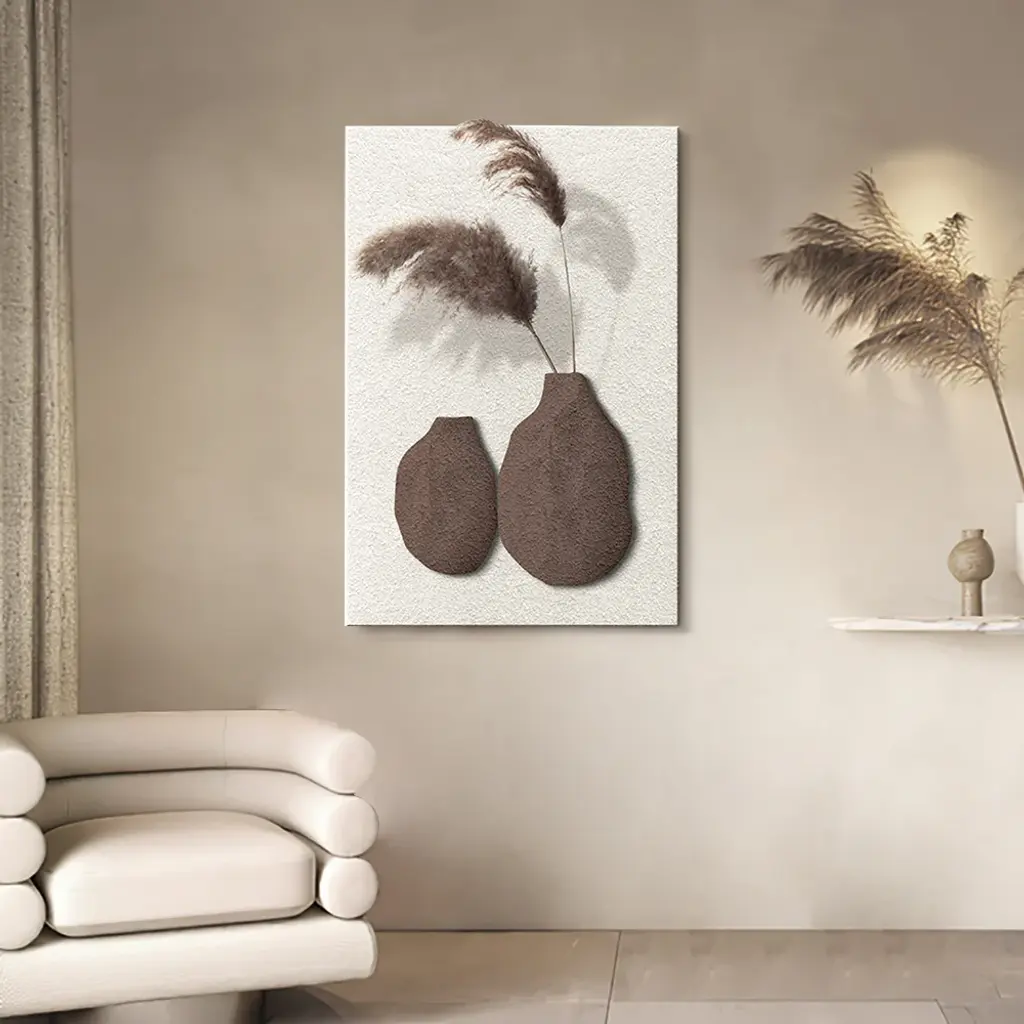 Bring calm sophistication into your home with this Japandi-inspired 3D wall art. Featuring earthy brown vases on a textured white backdrop, the sandstone-like finish adds depth and artistry. Crafted from durable engineered wood and sandstone, it elevates any living room, dining area, or bedroom with timeless elegance. Warm Reminder: The product does not contain flower plants.