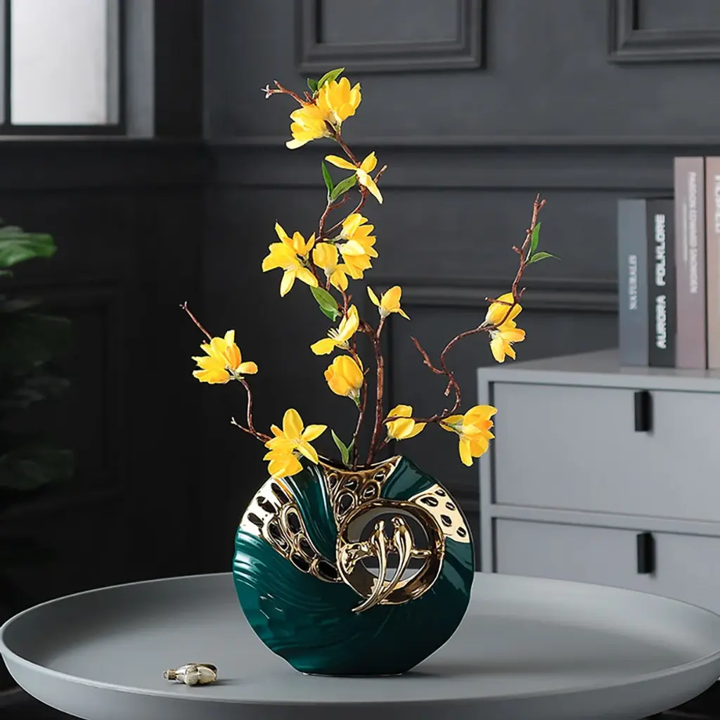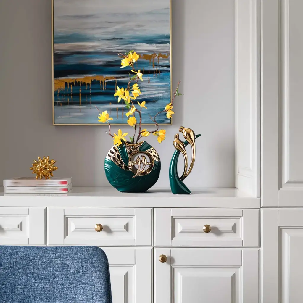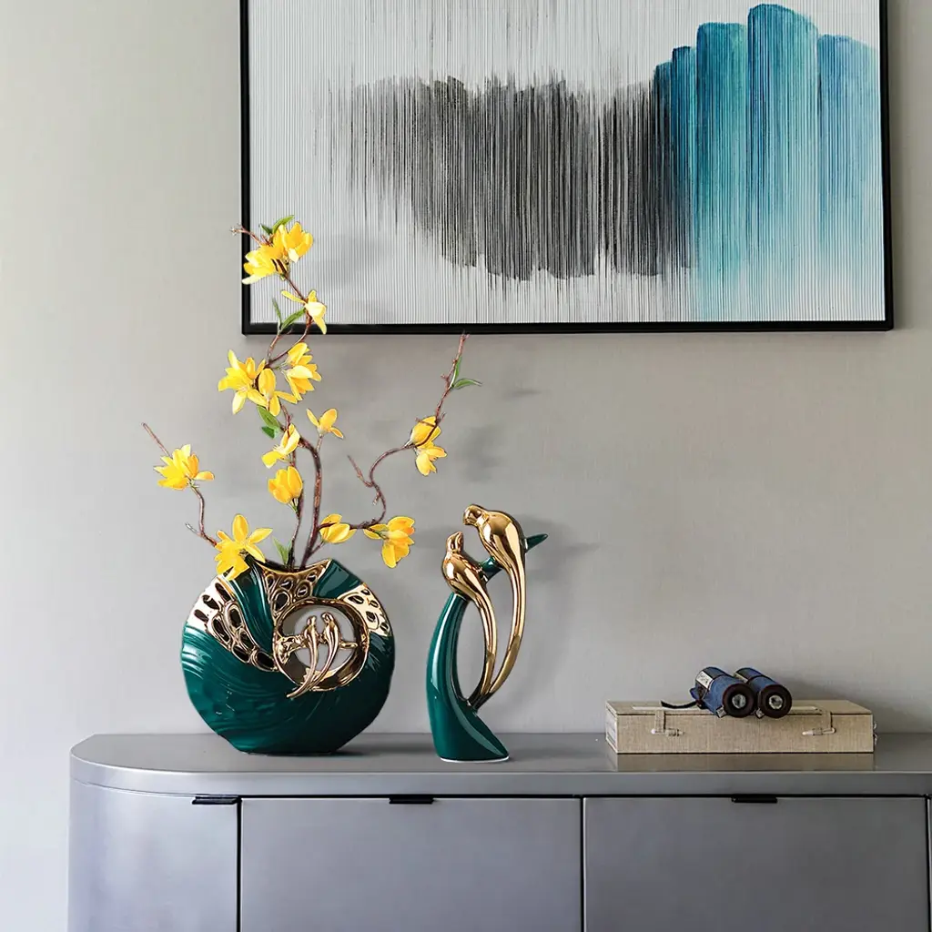 The magpie sculpture, which symbolizes loyal and romantic love, is paired with the same vase and bright yellow jasmine flowers, which fully reflects the beauty of spring nature. At the same time, it integrates creative design and modern home decoration, making it eye-catching. (This product needs to be compressed and transported with artificial flowers. After unpacking, you can refer to the pictures to organize and restore them. Due to the blooming conditions of the artificial flowers, the height and width of the product may be slightly different.)