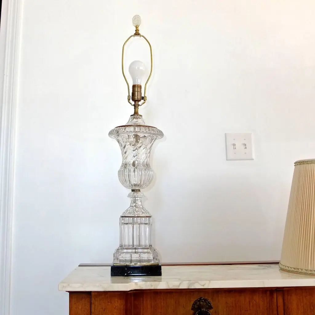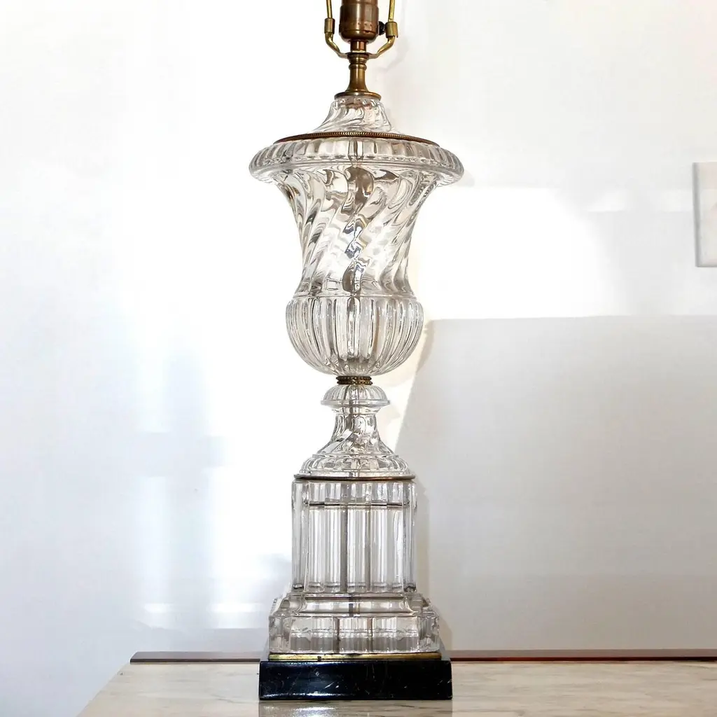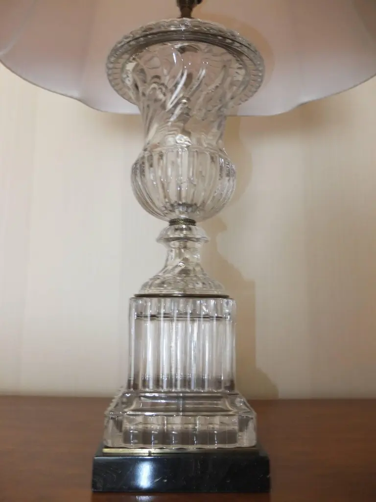 We have a total of three of these Baccarat style urn or vase form crystal lamps on square black veined marble bases with subtle bronze embellishments, by Paul Hanson Lighting Co. 20 inches high from table to top of glass urn below socket. Diameter 7.5 inches at widest flared rim of vase. Base 6 inches square. In the photos with the display shade the height is 35 inches from table to finial. Price shown is per lamp.Documented: Interiors magazine 1952-06: Vol 111 Issue 11